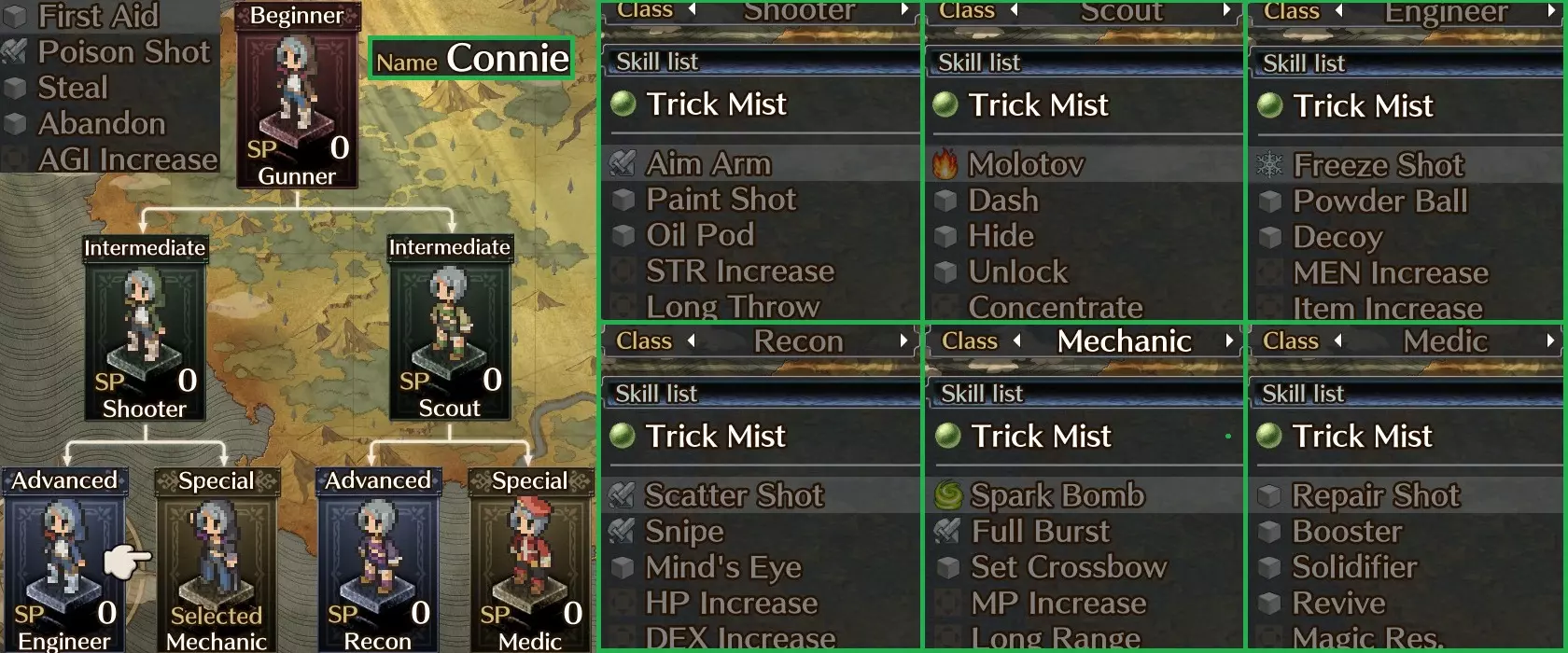 显著技能: 物品增加 - 详见上图 强化射击/固化射击/修复射击 - 出色的攻击/防御支援技能(修复射击=100%治疗) 审判 - 强力神圣属性物理攻击,因神圣抗性 debuff 而持续有效 散射射击 - 射程不错但目标选择灵活性有限 冰冻射击 - 额外的冰元素覆盖 火花炸弹及燃烧瓶 - 中距离火与风属性范围攻击 疾跑+隐匿 - 便于安全穿越地图获取宝箱 油囊及火药球 - 极为强力的 debuff,命中后能大幅提升伤害 梅丽莎比弗罗斯特妈妈