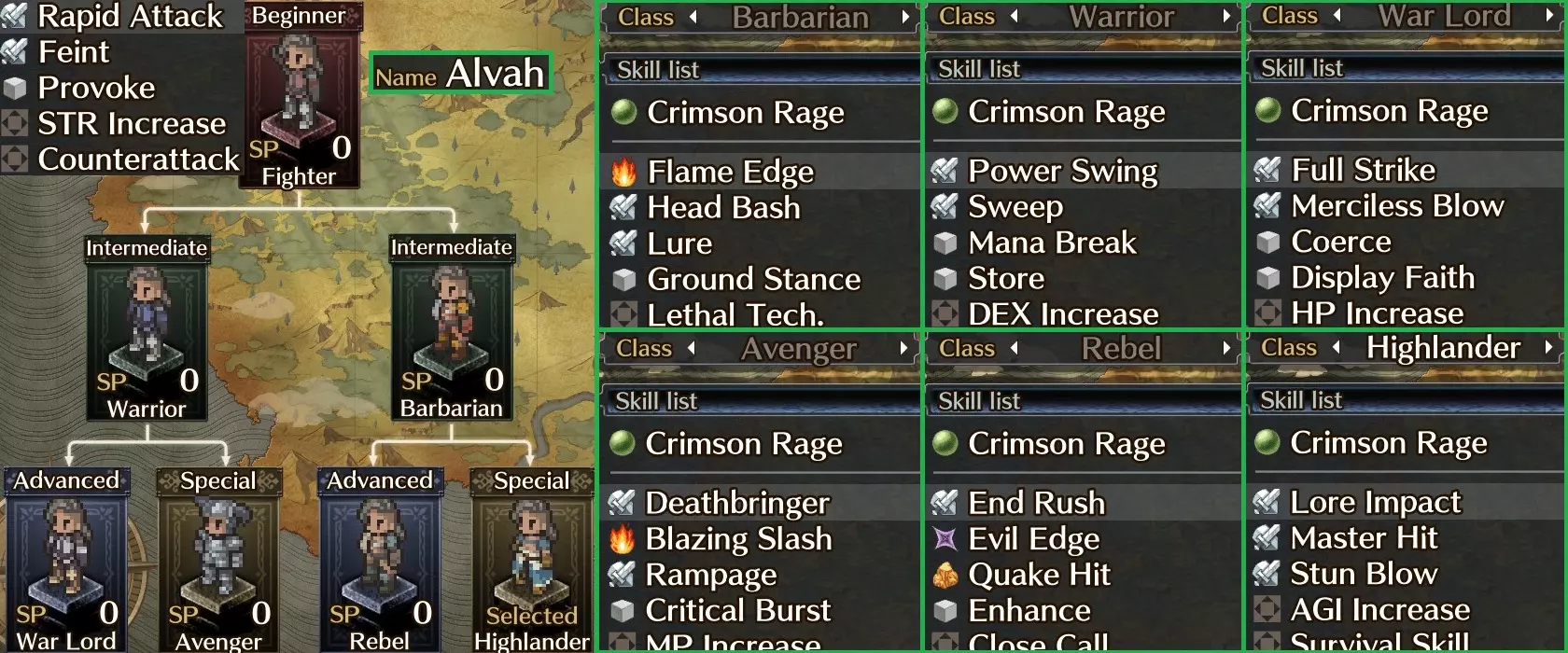 显著技能: 大地魂能 - 在各方面均优于灵魂 trance,且能显著提升魔力值 暗之审判 - 极强的单体暗属性魔法(生命汲取也不错) 陨石 - 无属性魔法,拥有良好的范围攻击能力 暴风雪 - 与陨石类似,但为冰属性 燃爆 - 若敌人对火属性有负抗性,可造成极高伤害 冻干 - 若敌人对冰属性有负抗性,可将其石化 阿尔瓦 - 成熟稳重的大哥型角色