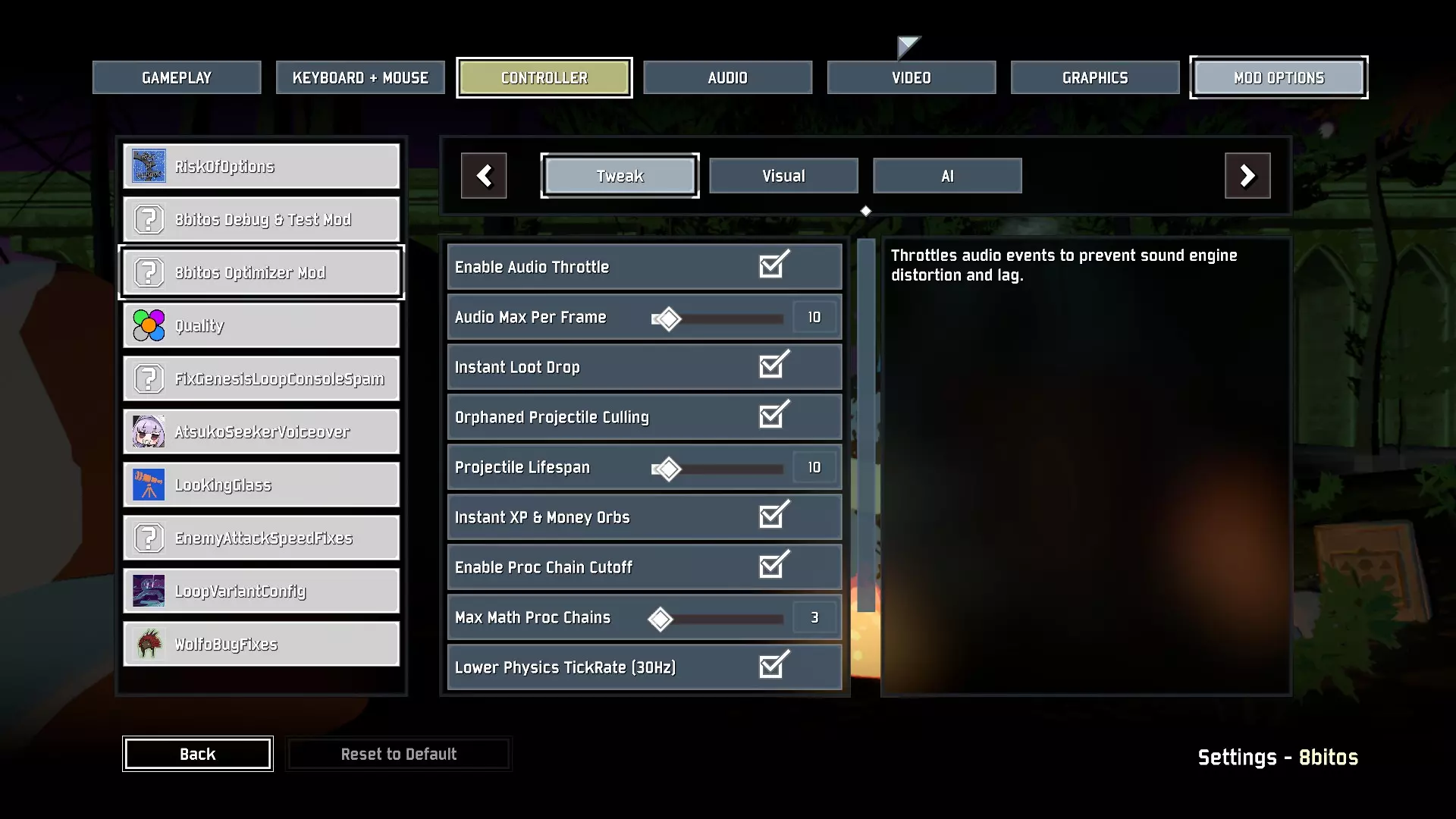 安装完成后,启动游戏,进入设置 > 模组选项 > 8bitos优化器模组。以下是配置方法: 视觉标签 距离动画冻结:开启 Unity引擎因即便敌人在很远的地方,也会计算其旋转的3D骨骼结构和行走动画而闻名。此设置会强制冻结所有远离你的怪物骨骼,可立即节省大量CPU矩阵计算。 全局特效硬上限:开启 限制屏幕上可存在的粒子效果绝对最大数量。当500枚导弹同时爆炸时,此设置会对爆炸效果施加严格限制,防止你的GPU崩溃导致游戏退出。尸体即时清除:开启 当20只怪物死于枪林弹雨之下时,它们的尸体会变成在地面上弹跳的布娃娃。计算尸体的重力和地形碰撞会导致CPU占用率飙升。此设置会在怪物死亡瞬间将尸体立即清除,以节省物理运算资源。 禁用界面:开启(可选,但在循环2之后强烈推荐) 在神级通关中,你每秒造成的伤害高达数百万。屏幕上显示的数千个浮动数字和数十个血条会使画面杂乱,并造成界面瓶颈卡顿。开启此选项可完全隐藏这些元素。 地图优化:开启 主动移除背景灌木、无用岩石、地图贴花和浓重的阳光阴影。当屏幕上一片混乱时,你甚至不会注意到它们已经消失,但这会释放大量显存。AI标签深度AI休眠:开启。完全禁用远离你的敌人的寻路功能。它们不会尝试计算迷宫路线来接近你,而是会静止不动并进入休眠状态,直到你靠近,这能极大减轻处理器的压力。启用AI交错:开启。通常情况下,敌人每秒更新60次寻路追踪。此设置会大幅交错远处敌人的思考频率,将它们的“脑力”分配到数秒内,避免CPU出现峰值。调整标签最大怪物数量:开启(将滑块设为40)。游戏总监在游戏后期喜欢生成数量多得离谱的敌人。这个名为【死神】的隐藏脚本会在游戏尝试超出你设定的数量限制时,默默删除屏幕外最弱、距离最远的怪物。 即时战利品掉落:开启 打开贵重宝箱时,物品会被抛向空中最终落到地面,这会浪费物理计算资源。此设置强制所有物品掉落和金币立即落到地面。 降低物理更新频率:开启 默认情况下,游戏每秒计算60次物理碰撞。开启此选项会将物理更新频率降低至30Hz。你的移动和战斗速度保持不变,但CPU用于计算重力的工作量会减少50%!
