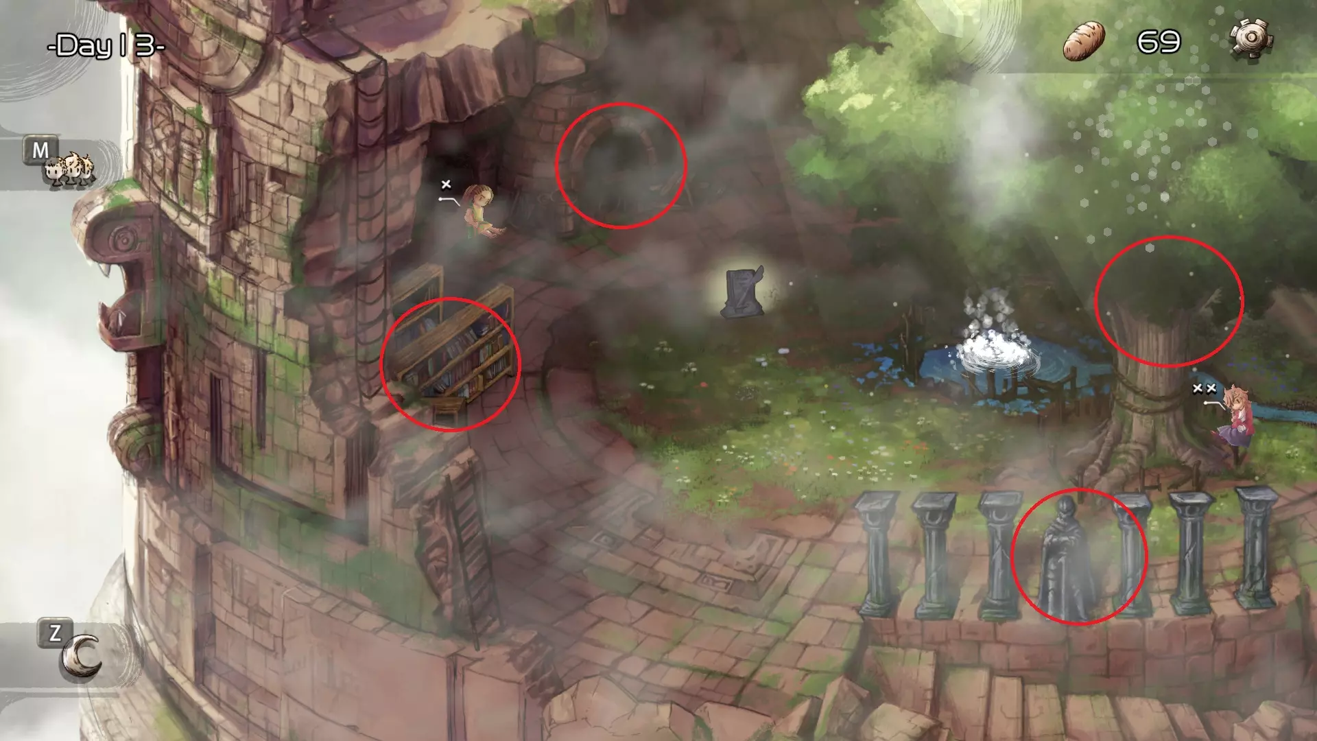 这是《Watcher of the Tower Achievement》的游戏攻略,展示了游戏第13天场景里的多个标记位置,玩家点击这些标记点,就能探索社区里的所有秘密,完成Watcher of the Tower成就。