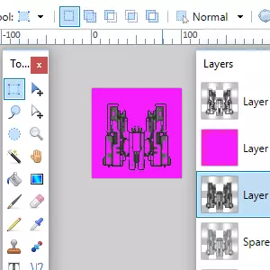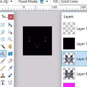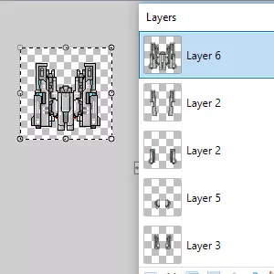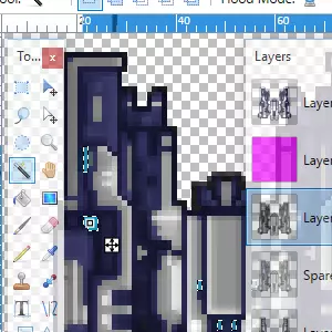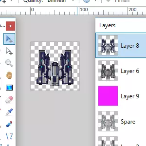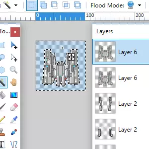你需要确保在这里选择了图层。选择水平翻转,这样你就会得到一个与第一个图层镜像的图层。回到图层控制界面。你需要选择“向下合并图层”选项,它就在“复制图层”旁边。这当然会将你当前选中的图层合并到其下方的图层中。你其实不必非得这么做,但我这么做是为了让图层列表更整洁一些,以防之后还需要回到这里操作。 从这里开始,只需重复以下步骤:在画图软件中打开精灵部件。将它们调整到你喜欢的方向,然后复制到图像编辑软件中,把你的飞船组装起来。