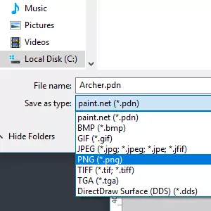 我们在paint.net里的操作差不多完成了。关闭所有不需要的额外图层,直到你得到带有空白背景的精灵图。现在点击另存为,在类型下拉菜单中选择png格式。我把我的精灵图命名为“弓箭手”,你当然可以选择任何你喜欢的名字。