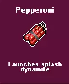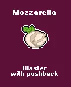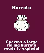 蓝纹奶酪 - 在你周围散发刺鼻气味 布拉塔奶酪 - 生成一个巨大的滚动布拉塔奶酪,随时准备爆炸! 青橄榄 - 发射3枚喷雾弹 火腿 - 机枪式发射小肉弹