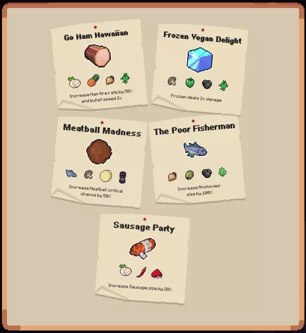 通过击杀 Boss 怪物获取【黄色】番茄罐头(如图所示)可以获得食谱。目前共有 5 种食谱(还有完美切片,但那是个秘密,嘘),每种食谱只需 1 个对应物品即可激活。它们分别是: 夏威夷狂欢:- 火腿、马苏里拉奶酪、菠萝、洋葱和混合香草 效果:火腿射速提升50%,子弹速度变为2倍 冰冻素食盛宴:- 冰块、蘑菇、甜椒、黑橄榄和混合香草 效果:冰冻伤害变为2倍 肉丸狂欢:- 肉丸、凤尾鱼、蘑菇、普罗卧干酪和黑胡椒 效果:肉丸暴击率提升50% 可怜渔夫:- 凤尾鱼、洋葱、青橄榄、黑橄榄和牛至 效果:凤尾鱼尺寸增大100% 香肠派对:香肠、马苏里拉奶酪、辣椒和辣椒粉 效果:香肠尺寸增大20% 宠物与世界/区域 注:我已修正部分拼写错误,因此并非所有信息都与当前游戏内内容一致,本指南基于哪个版本可参见上述介绍。此外,宠物不会按照宠物选择列表中的顺序出现。以下是经过游戏测试后确认正确的宠物,请检查它们的列表。如果你发现宠物出现在错误的世界,请反馈。