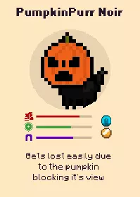 强盗女巫 - 巨大的帽子遮挡了它的视线,很容易迷路 幽灵小怪 - 没人注意时,小幽灵会快速乱窜(我还以为写的是“Goatise”,所以觉得是只毛茸茸的山羊呢) 幻影幼犬 - 一团带着幽灵面具的雾气,将活泼的吠叫与幽灵般的神秘融合在一起(我还加了“偶尔会在手机上轻轻喘气”) 布 Boo 熊 - 戴着熊帽子的猫咪,野性十足(或者“恶魔们对这只凶猛的猫咪几乎毫无准备”)