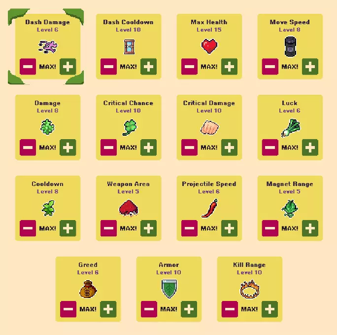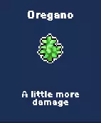 罗勒 - 略微减少冷却时间 黑胡椒 - 移动速度小幅提升 辣椒 - 子弹速度加快 细香葱 - 增加运气