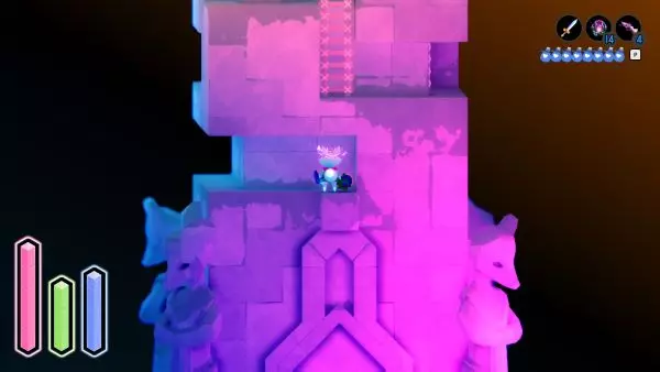 在你进入的第一座神庙中,会看到一座有3只狐狸的雕像。雕像下方的地板上有一些地砖,你需要用方向键按顺序踩踏它们。 上-右-上-左-上-右-上-左-上-右-下-右-上-上-左