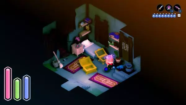 游戏开始后,向前走会看到前方有楼梯,左侧有一扇亮着灯的门。进入门内,你会发现一个宝箱,里面装有一根木棍。拿到木棍后,成就【A Sword!】将会解锁。