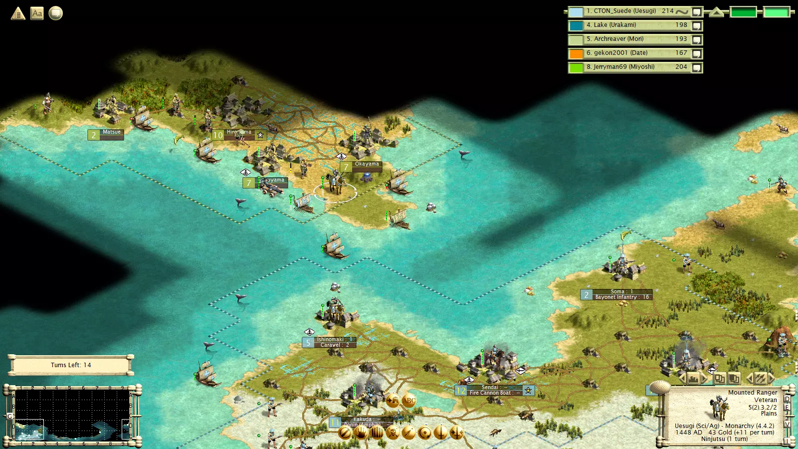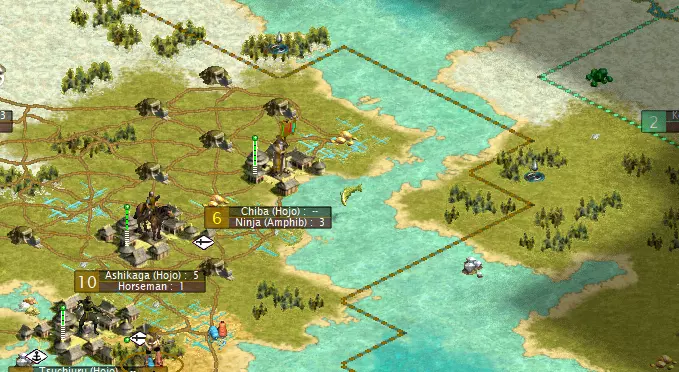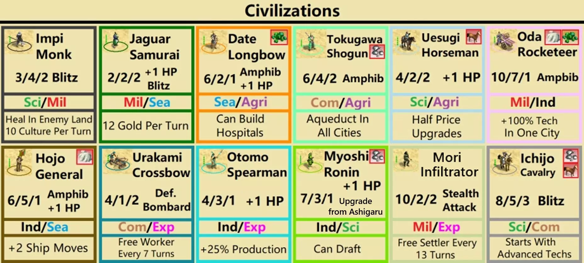 与MPT类似,文明都有其专长,拥有不同的玩法风格、优势和劣势。它们拥有独特单位、2种特质以及一项“能力”。大多数能力需要通过建造一个消耗1盾牌的小型奇观来解锁,该奇观在游戏开始时即可建造。明石和一条两家文明初始即解锁其能力。 请注意,所有奇观都会带来黄金时代。因此,如果你无法获取独特单位,可以考虑建造一个奇观。黄金时代持续12回合。 文明通常有颜色编码,使其与《文明3》原版中最相似的文明共享同一种颜色。 明石:明石是波斯的克隆体。它们具备科技/工业特质,其浪人单位(类似剑士)获得+1生命值,而其能力为可以征召石弩手或武士弓箭手。通常来说,他们的目标是组建一支庞大的末日部队,征召大量弓箭手进行防御轰炸,然后率领这支大部队横扫敌方领土。 今川家:今川家与祖鲁类似。武士是一种非常强大的机动单位,解锁时间很早。其属性为3/4/2,并且拥有闪电战能力。他们的特殊能力是战场医疗(同时为城市提供10点文化值),这使得武士在敌方领土上能造成极大的麻烦。不过,今川家的特质是军事/科学。因此,如果他们不在早期削弱敌人,其后期的发展和实用性将会受到限制。 阿伊努:阿伊努类似于《喵喵的结合》中的阿兹特克。他们的特色单位(一种拥有+1移动力的足轻)需要消耗10个盾牌,但该单位还拥有+1生命值和闪电战能力。阿伊努的特殊能力是每回合获得12金币。他们兼具军国主义与航海特性,即便在大陆和群岛地图上也能有所作为。 德川:这是凯尔特人的翻版。他们拥有移动力+1的浪人。与高卢剑士类似,但造价略高。他们具备商业特性,这是个较弱的特质,但他们能很好地加以利用。他们还拥有农业特性,其文明能力是所有城市免费获得水渠。这使得他们能让尽可能多的城市发展到7级规模并获得商业加成。 织田:织田拥有一个后期独特单位(火绳枪兵,攻击+2,防御+1)。但他们在早期游戏中依然强大。他们兼具军国主义和工业特性,其文明能力是首都科技研究速度翻倍,这让他们能更早地轻松制定进攻策略。我建议建造一座奇观来触发黄金时代,否则黄金时代会来得很晚。 大友氏:大友氏具有勤劳和扩张主义特质。他们的特色单位是 spearman(矛兵),拥有+1攻击力和+1生命值,可以在需要时触发黄金时代。他们的优势是首都产能+25%。总的来说,他们就是彻头彻尾的霸主,能轻易压制任何在其附近诞生的文明。如果你的初始位置比较孤立,也可以尝试建造奇观。 一条氏:一条氏是个奇特的文明。他们的特质较弱,具有商业和科学属性。他们的特色单位在科技树中出现较晚,造价高昂(35产能),但可以说是游戏中最强大的单位。它是 ronin horseman(浪人骑兵)的替代单位,移动力+1,并且拥有闪电战能力。但在许多开局和位置情况下,一条寺(Ichijo)文明很难存活那么久、发展到那么高的科技水平,或是获取到那些资源。使他们成为一个灵活且危险文明的原因,甚至在游戏初期,就是他们的特性。他们开局拥有4项科技,其中一些位于科技树深处。由于科技前置条件的机制,他们可以跳过某些科技,例如能够直接研究桥梁建造或哲学。如果他们立即着手研究哲学,通常应该能获得免费的哲学科技。 大和(Date)文明是农业和航海属性的。在航海地图上,他们是一个后期能力很强的选择。他们的特性是能够建造医院,医院可提供防御加成。他们的特色单位是特殊版本的弓武士,拥有+1生命值和“两栖”能力。