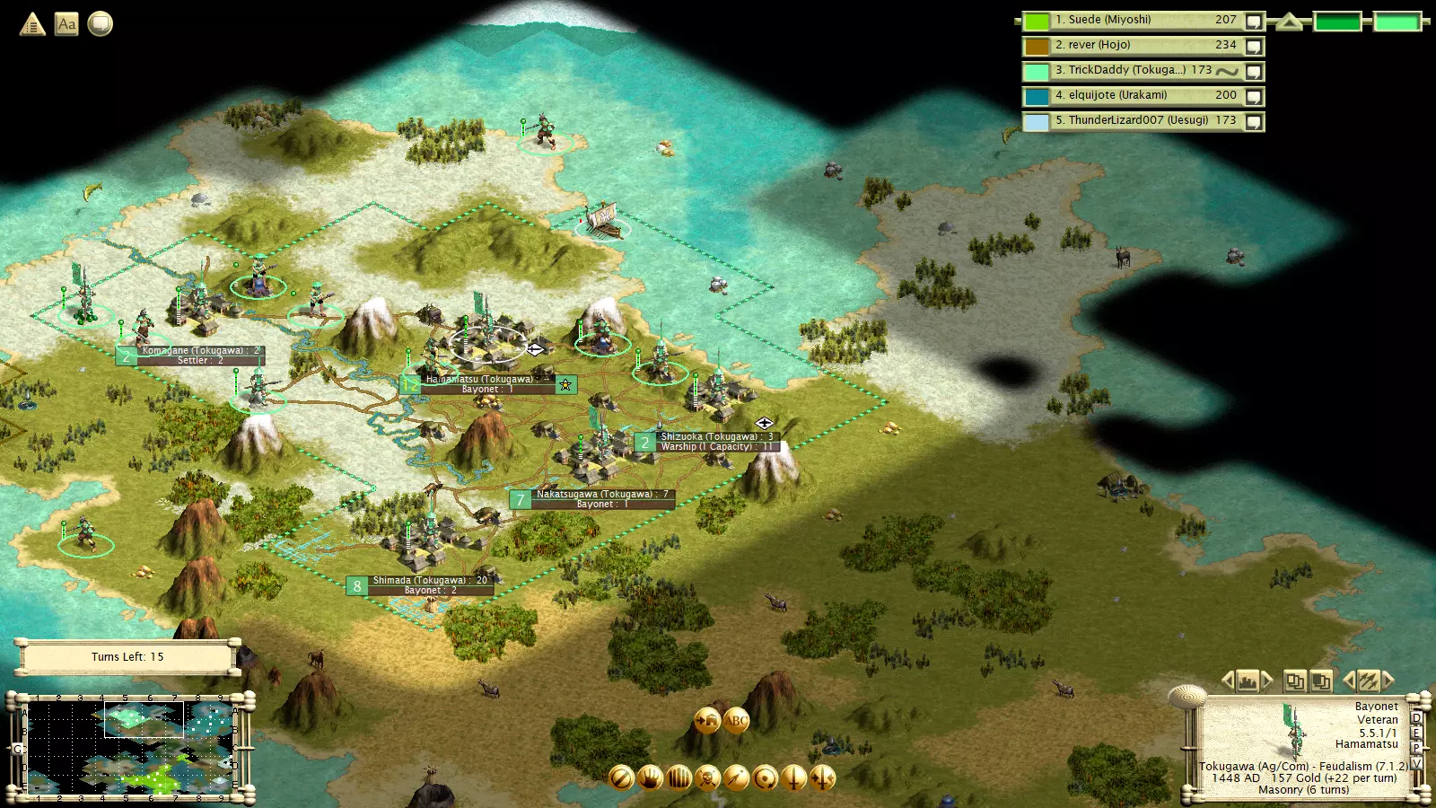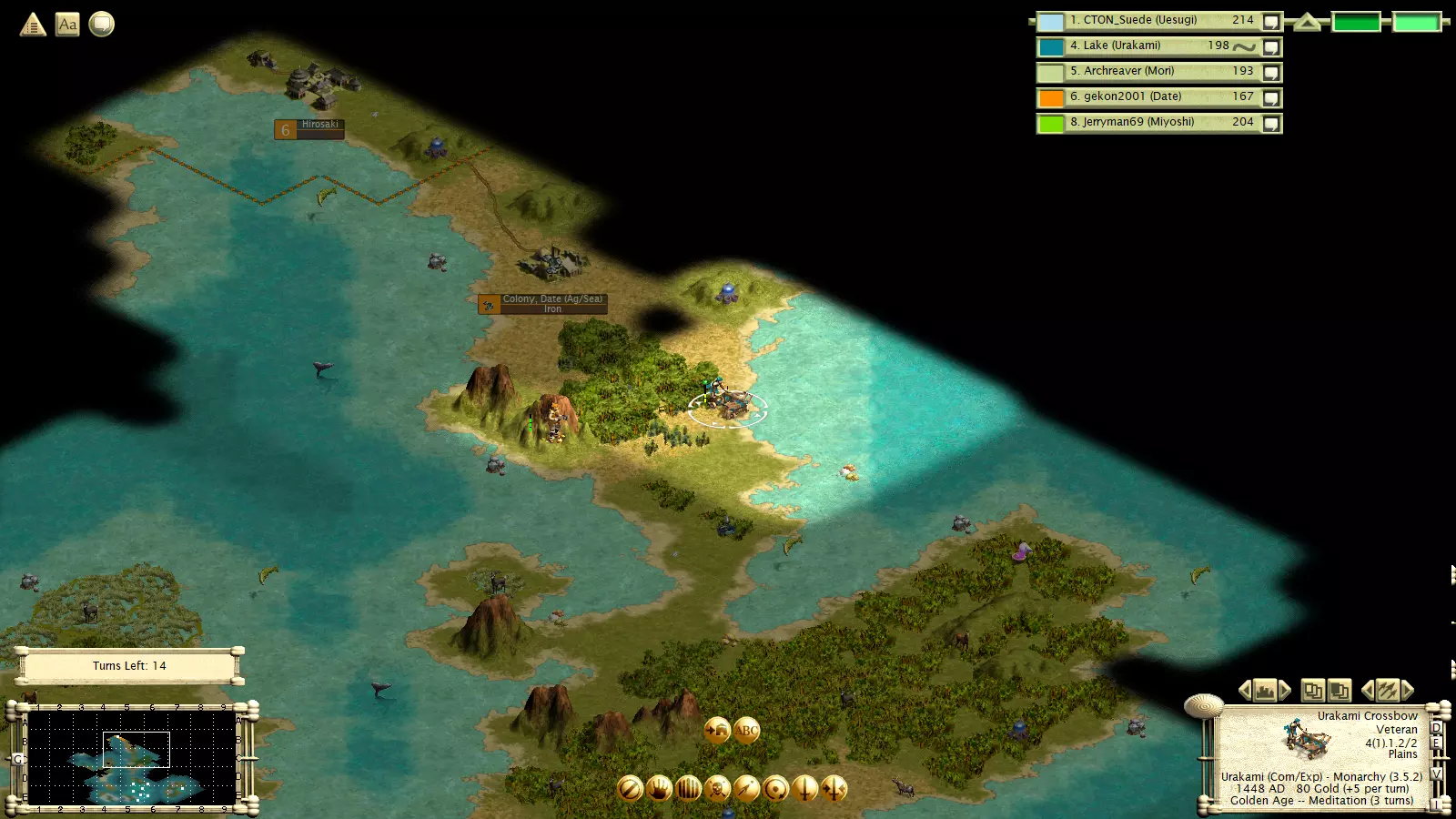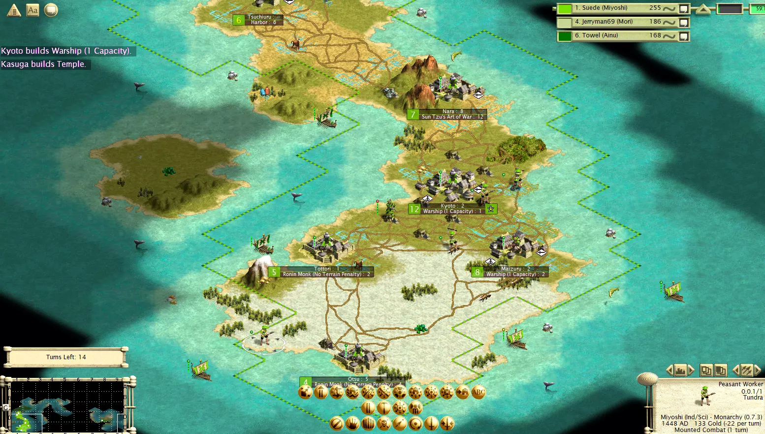 与MPT类似,文明都有其专长,拥有不同的玩法风格、优势和劣势。它们拥有独特单位、2种特质以及一项“能力”。大多数能力需要通过建造一个消耗1盾牌的小型奇观来解锁,该奇观在游戏开始时即可建造。明石和一条两家文明初始即解锁其能力。 请注意,所有奇观都会带来黄金时代。因此,如果你无法获取独特单位,可以考虑建造一个奇观。黄金时代持续12回合。 文明通常有颜色编码,使其与《文明3》原版中最相似的文明共享同一种颜色。 明石:明石是波斯的克隆体。它们具备科技/工业特质,其浪人单位(类似剑士)获得+1生命值,而其能力为可以征召石弩手或武士弓箭手。通常来说,他们的目标是组建一支庞大的末日部队,征召大量弓箭手进行防御轰炸,然后率领这支大部队横扫敌方领土。 今川家:今川家与祖鲁类似。武士是一种非常强大的机动单位,解锁时间很早。其属性为3/4/2,并且拥有闪电战能力。他们的特殊能力是战场医疗(同时为城市提供10点文化值),这使得武士在敌方领土上能造成极大的麻烦。不过,今川家的特质是军事/科学。因此,如果他们不在早期削弱敌人,其后期的发展和实用性将会受到限制。 阿伊努:阿伊努类似于《喵喵的结合》中的阿兹特克。他们的特色单位(一种拥有+1移动力的足轻)需要消耗10个盾牌,但该单位还拥有+1生命值和闪电战能力。阿伊努的特殊能力是每回合获得12金币。他们兼具军国主义与航海特性,即便在大陆和群岛地图上也能有所作为。 德川:这是凯尔特人的翻版。他们拥有移动力+1的浪人。与高卢剑士类似,但造价略高。他们具备商业特性,这是个较弱的特质,但他们能很好地加以利用。他们还拥有农业特性,其文明能力是所有城市免费获得水渠。这使得他们能让尽可能多的城市发展到7级规模并获得商业加成。 织田:织田拥有一个后期独特单位(火绳枪兵,攻击+2,防御+1)。但他们在早期游戏中依然强大。他们兼具军国主义和工业特性,其文明能力是首都科技研究速度翻倍,这让他们能更早地轻松制定进攻策略。我建议建造一座奇观来触发黄金时代,否则黄金时代会来得很晚。 大友氏:大友氏具有勤劳和扩张主义特质。他们的特色单位是 spearman(矛兵),拥有+1攻击力和+1生命值,可以在需要时触发黄金时代。他们的优势是首都产能+25%。总的来说,他们就是彻头彻尾的霸主,能轻易压制任何在其附近诞生的文明。如果你的初始位置比较孤立,也可以尝试建造奇观。 一条氏:一条氏是个奇特的文明。他们的特质较弱,具有商业和科学属性。他们的特色单位在科技树中出现较晚,造价高昂(35产能),但可以说是游戏中最强大的单位。它是 ronin horseman(浪人骑兵)的替代单位,移动力+1,并且拥有闪电战能力。但在许多开局和位置情况下,一条寺(Ichijo)文明很难存活那么久、发展到那么高的科技水平,或是获取到那些资源。使他们成为一个灵活且危险文明的原因,甚至在游戏初期,就是他们的特性。他们开局拥有4项科技,其中一些位于科技树深处。由于科技前置条件的机制,他们可以跳过某些科技,例如能够直接研究桥梁建造或哲学。如果他们立即着手研究哲学,通常应该能获得免费的哲学科技。 大和(Date)文明是农业和航海属性的。在航海地图上,他们是一个后期能力很强的选择。他们的特性是能够建造医院,医院可提供防御加成。他们的特色单位是特殊版本的弓武士,拥有+1生命值和“两栖”能力。
