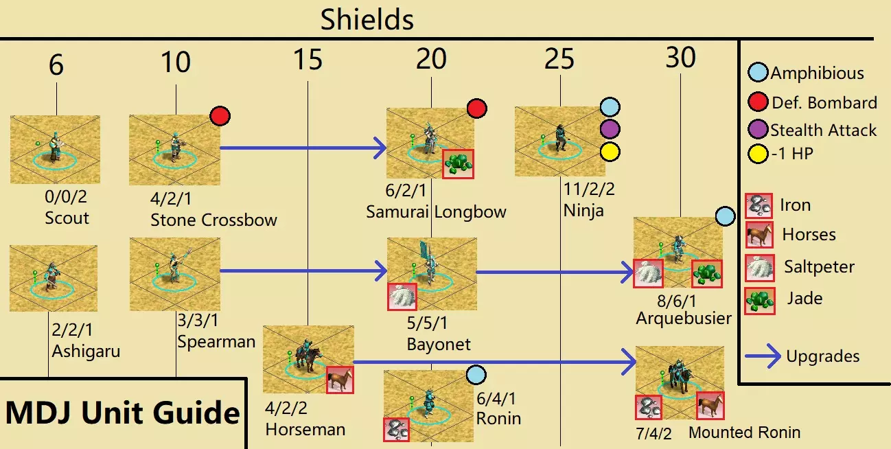 单位平衡与MPT相当类似,但有一些关键变化以鼓励进攻。 - 船只通常更快且更容易获取。 - 单位的攻击/防御数值大多翻倍。这意味着实际上,标准“弓箭手”单位(石弩手)的防御炮击效果减半。 - 这也使我们能更精确地调整数值。例如,石弩手的数值为4/2/1。而长矛兵不再是2/4/1,而是3/3/1。因此,它们的总强度相近,但更便于进攻使用。 - 请记住这一点:将攻击和防御数值减半,你就能大致了解该单位在常规原版《文明3》中的强度。升级路径 以下是MDJ中的所有单位升级路线: 石弩手→武士弓箭手 骑兵→骑马武士 长矛兵→刺刀步兵→火绳枪兵 工人→快速工人 卡拉维尔帆船→西班牙大帆船 所有特色单位均按常规升级。升级成本略高于MPT(每盾牌4金币,而非3金币),但你将拥有更多金币。 海军战斗 浪人、忍者和火绳枪兵均具备两栖攻击能力。此外,伊达家和北条家的特色单位也拥有两栖攻击能力。