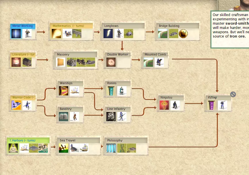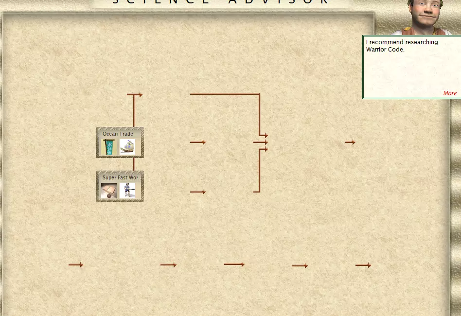 哲学:首个解锁该科技的文明可获得一项免费科技。 海上贸易:允许单位在海洋地格上移动。 工人速度翻倍:使工人工作速度提升一倍。 桥梁建造:获得建造桥梁的能力(通常在工程学科技中解锁)。 进入下一个时代后: 远洋贸易:允许单位在远洋地格上移动。 科技树末端的【超级快速工人】科技可让你升级工人。升级后的工人拥有2点移动力,且不受地形移动惩罚。这能让你快速在地图上铺设道路,并尝试达成在67回合限制下原本无法完成的胜利条件。