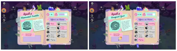 在你的花园左上角,你可以找到女巫WiFi——一棵名副其实的魔法树。每一个小蘑菇都代表一个你可以解锁的法术。目前,总共有21种不同的法术。你可以通过将所需材料带给对应的蘑菇来解锁新法术。 不过,并非所有蘑菇/法术都能从一开始就解锁,毕竟它们是魔法树。你可以在地面上看到魔法树的路径,蘑菇之间由小苔藓 patch 连接。这棵树有三个主要分支可供你探索。 法术类型