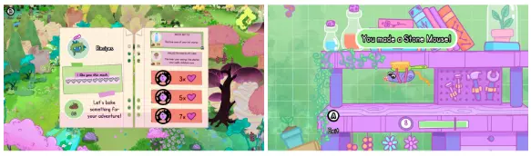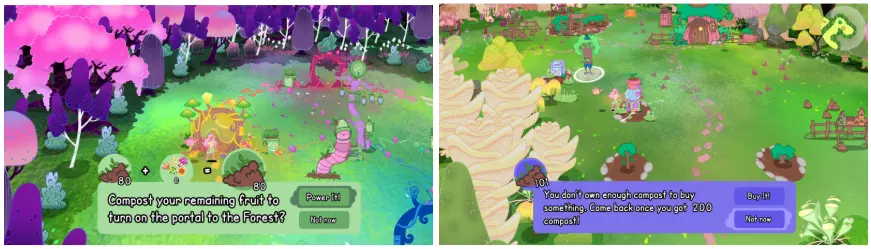 每个村民的友谊等级为0到10级。你可以在你的魔法书(grimoire)中查看友谊等级。友谊等级越高,在玩坩埚(cauldroven)小游戏时可选择的魔法技艺(Charmstries)就越多。一些最棒的魔法技艺(Charmstries)只有在与村民的友谊等级达到7级后才能解锁,因此投入精力经营友谊是值得的! 礼物:植物会掉落稀有果实!你不仅可以用它们在花园中进行特定解锁和制作配方,还可以将它们赠送给森林里的村民。 每个村民都有特定的喜爱和讨厌的稀有果实。如果你送给村民他们感觉一般或喜爱的礼物,将会提升与该村民的友谊(当然,喜爱的水果会增加更多友谊值)。如果送给他们讨厌的水果,友谊值会略微下降。 每当你送给村民他们喜爱或讨厌的水果时,你的魔法书会更新,以便你日后查看他们的偏好。 房屋任务:每个村民都有一条可完成的任务线。完成任务线后,他们会搬进森林,并且每个村民都有自己超级可爱的房子!但这并非仅仅是为了装饰:完成他们的任务线后,你将获得以下好处: 森林第二层的村民,在每次游戏中,他们的花园里会随机出现两台自动售货机。你可以在那里购买新物品或使用你的【Reconjurator】。 森林第三层的村民,他们的自动售货机里有瓶装水。这很有用,因为在对付村民后院的巨型植物之前,你可以恢复一些能量! 其他提示 游戏内获取提示