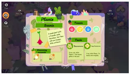 在《魔法书丛林》中,你最常做的事可能就是用你的法术给植物注入能量。每种植物都需要特定类型的能量:风、土、火或水。植物所需的能量类型可以从它们的身体上看出来——每株植物都有某些身体部位呈现出对应元素的颜色。红色代表火,蓝色代表水,黄色代表土,青绿色代表风。有些植物甚至会随着时间的推移改变它们所需的元素! 你可以通过手柄上的方向键、键盘上的1到4键(或滚动鼠标)来改变法术的元素类型。 尽管在《魔法书丛林》中没有杀戮或死亡的设定,但保持小心仍然很重要!如果你长时间不给植物喂食、喂它们讨厌的能量类型,或者离开与你相连的植物,你就会失去能量。这最终会让你睡着(见下一条提示)! 睡着