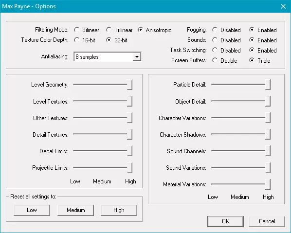 图片取自PCGaming 《马克思·佩恩》是由Remedy开发、RocStar发行的2003年电子游戏。我想指出的是,这款游戏由其工作室完成并优化。而《古墓丽影6:黑暗天使》则未完成,其设置工具甚至能难倒一个12岁的孩子。 配置 下面你将看到该游戏的默认设置图片。