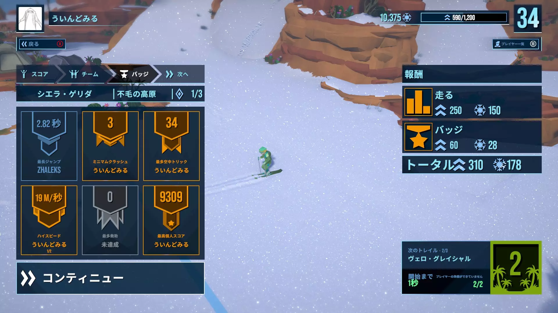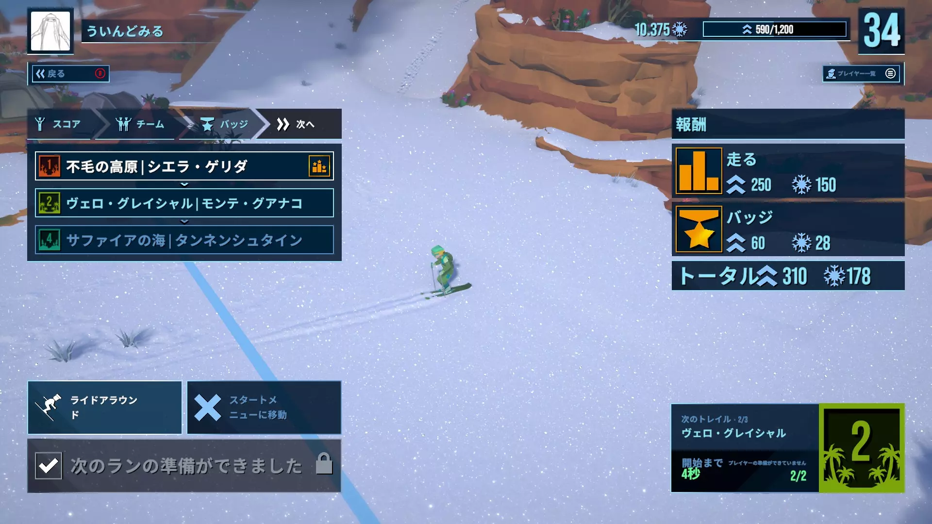 下面以谢拉·盖里达1的荒芜高原为例进行说明。准备好所需物品后,就实际滑行吧。一边快速赚取分数,一边滑向终点前。