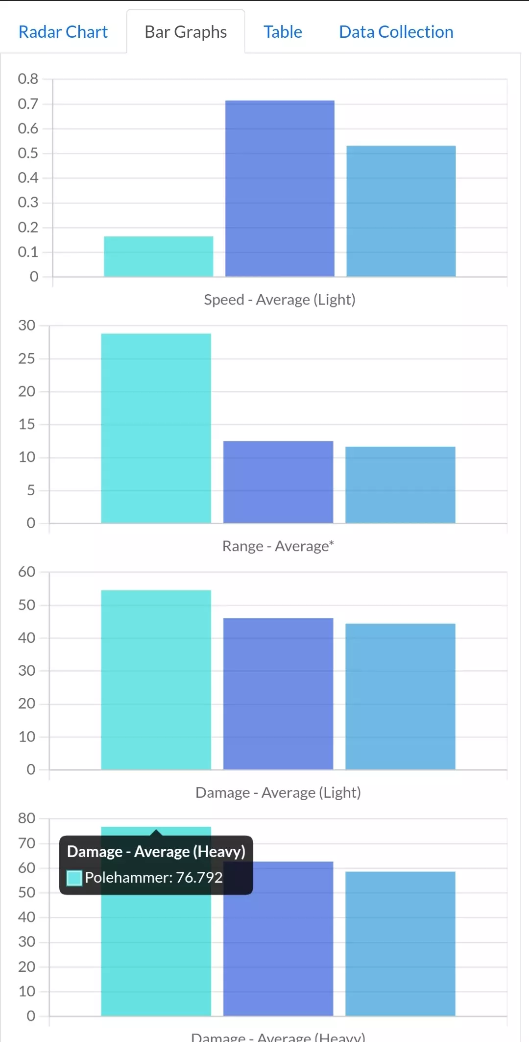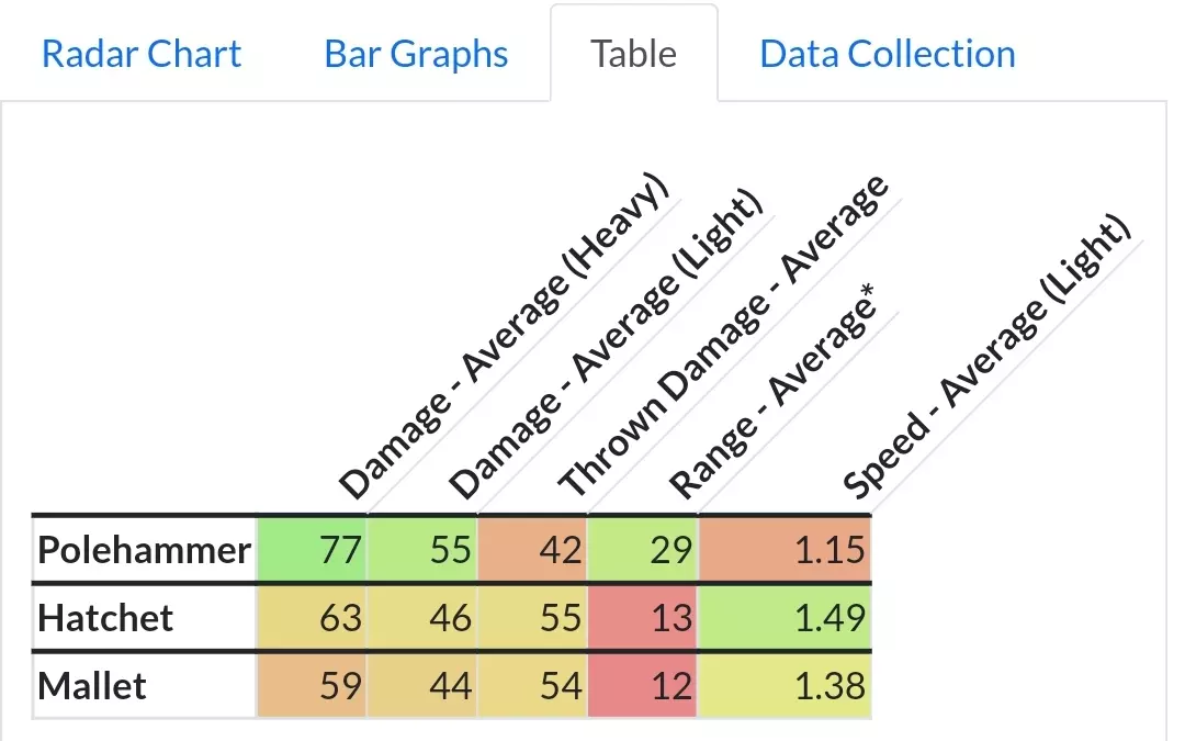 这是《骑士精神2》的武器属性可视化与对比工具——长柄战锤,它由社区开发,可展示武器速度、范围、伤害等数据,支持雷达图、柱状图、表格等形式呈现,还能模拟1vX场景下的战斗情况,助力玩家对比武器数据。