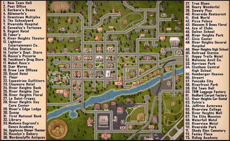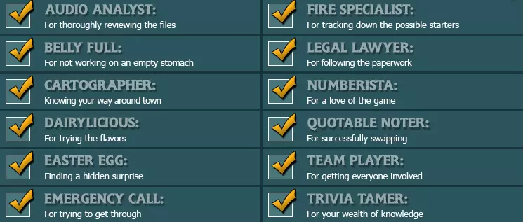 音频分析师 彻底检查所有文件 从证据柜中取出媒体卡后,收听所有五名嫌疑人的访谈(包括南希的)。 吃饱喝足 不让肚子空着工作 在警察局吃至少12份汉娜爱心包裹里的零食。 地图绘制师 熟悉城镇路线 在城市地图上广泛驾驶,访问至少10个非必要地点。 1. 芬利广场 2. 公墓 3. 费恩家 4. 马文家 5. 德鲁律师事务所 6. 马奥尼铁砧公司 7. 披萨宫殿 8. 杜加德夫人舞蹈学院 9. 校园操场 10. 里弗海茨动物园 11. 里弗海茨购物中心 12. 河畔公园 13. 哈里森公园 14. 机场