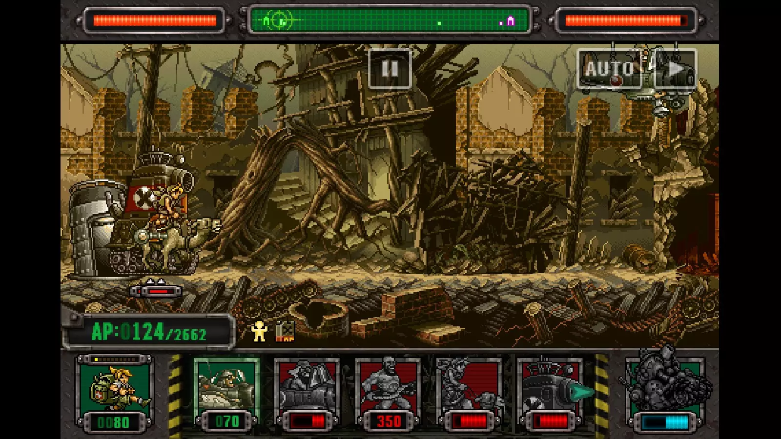 接下来派遣一些生命值较高的单位,我使用了炮塔组合(NOP-03 Sarubia)以及骆驼(SV-Camel)。接下来的步骤就是花费80AP进行下一次AP升级,然后使用另一架武士战机,之后重复我们已经做过的操作。 该战术的实际应用: