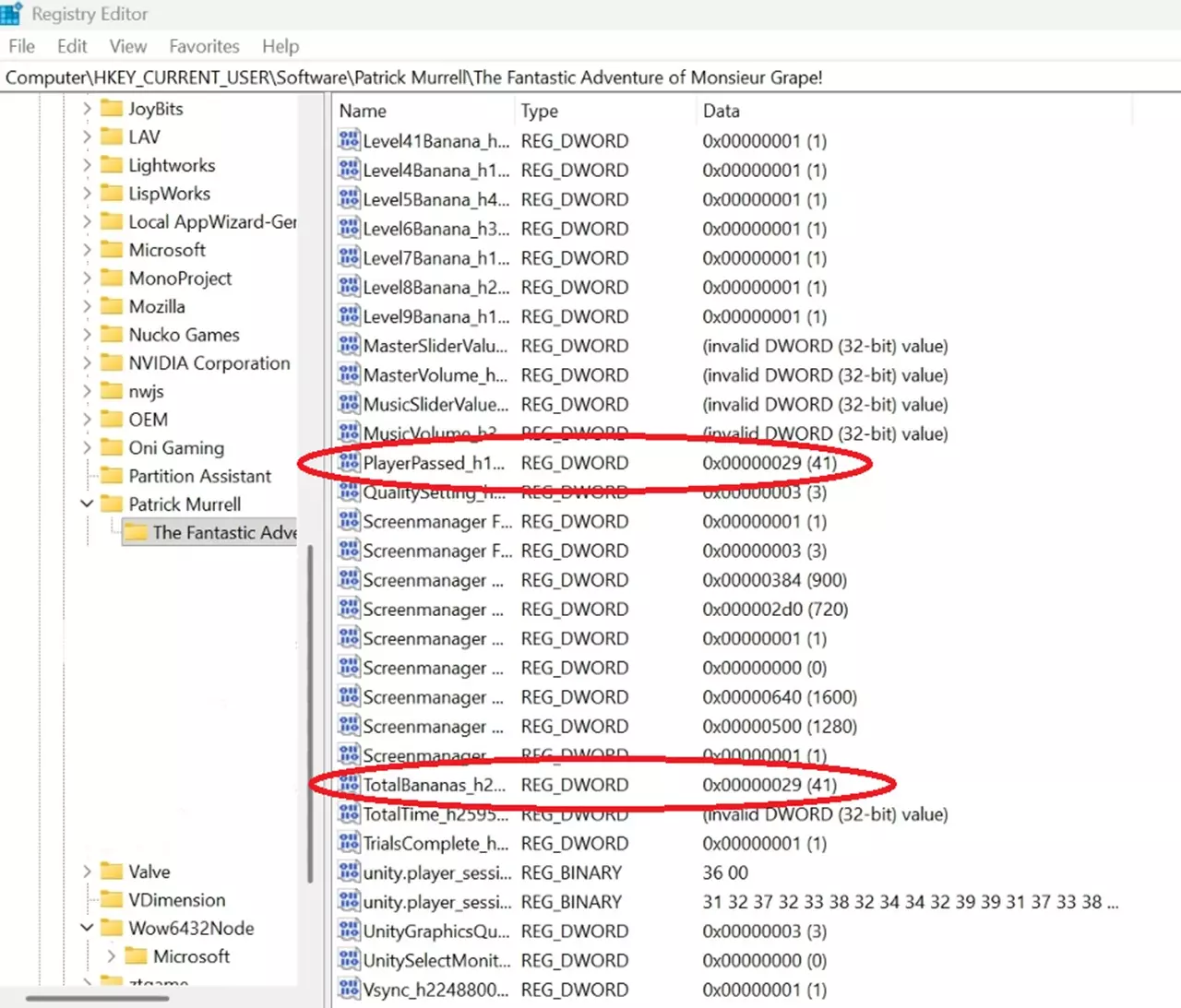 3) 然后进入“HKEY_CURRENT_USER”,接着是“SOFTWARE”,选择“Patrick Murrell”,再选择游戏名称【葡萄先生的奇幻冒险】。 4) 向下滚动,右键点击下图中圈出的标签。选择“修改”,然后选择“十进制”,输入下图中显示的数字(41)。 5) 你还可以看到标有“level names”的地方,如果你愿意,可以重复上述步骤,但在点击“十进制”后添加数字1。