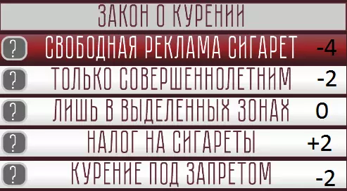 语言问题 1) +8 2) +4 3) 0 4) -4 5) -8 公民身份问题 1) +8 2) +4 3) 0 4) -4 5) -8 国家体制 1) -8 2) -4 3) 0 4) +4 5) +8 经济自由度 经济自由度 最大值 100 最小值 -100 75-100 自由放任(LAISSEZ-FAIRE) 40-75 受控市场 5-40 统制经济 -29-5 混合经济 -65- -30 国家资本主义 -100- -65 国家垄断 道路法 1)+6 2)+3 3)0 4)-3 5)-6 养老金保障 1)+6 2)+3 3)0 4)-3 5) -6 劳动法 1)+6 2)+3 3)0 4)-3“熟人”已完全融入东方阵营(经济自由度>-30 政治自由度<75)5)-6 酒精法案 1)+6 2)+3 3)0 4)-3 5)-6 吸烟法案 1)+6 2)+3 3)0 4)-3 5)-6 大麻法案 1)+6 2)+3 3)0 4)-3 5)-6 医疗保健 1)-6 2)-3 3)0 4)+3 5)+6 政府干预 1)-6 2)-3 3)0 4)+3 5)+6 博彩业 1)-6 2)-3 3)0 4)+3 5)+6 公民身份问题 1)+6 2)+3 3)0 4)-3 5)-6 公共交通 1)-6 2)-3 3)0 4)+3 5)+6 财产税 1)-6 2)-3 3)0 4)+3 5)+6 个人所得税 1)-6 2)-3 3)0 4)+3 5)+6 土地税 1)-6 2)-3 3)0 4)+3 5)+6 公共事业服务 1)-6 2)-3 3)0 4)+3 5)+6 增值税 1)-6 2)-3 3)0 4)+3 5)+6 社会福利金 1)+6 2)+3自我实现自由 自我实现自由 最大值102 最小值-90 75-102 大规模自我实现 40-65 有限机会 10-40 最小机会 -30- -10 精英主义 -65- -30 无权 -90- -65 种姓制度 武器携带法 1) -4 2) -2 3) 0 4) +2 5) +4 边境管控 1) +5 2) +3 3) 0 4) -2 5) -4 养老金保障 1) -5 2) -2 3) 0 4) +2 5) +4 污染管控 1) -5 2) -2 3) 0 4) +2 5) +4 劳动法 1) -4 2) -2 3) 0 4) +2 5) +5 司法管控 1) +5 2) +2 3) 0 4) -2 5) -4酒精法案 1) -4 2) -2 3) 0 4) +2 5) +5 吸烟法案 1) -4 2) -2 3) 0 4) +2 5) -2 大麻法案 1) +5 2) +2 3) 0 4) -2 5) 0 警察权力 1) +5 2) +2 3) 0 4) -2 5) -4 特勤部门权力 1) +4 2) +2 3) 0 4) -3 5) -5 医疗保健 1) +5 2) +3 3) 0 4) -2 5) -4 堕胎法案 1) -4 2) -2 3) 0 4) +2 5) +5 博彩业 1) +5 2) +2 3) 0 4) -2 5) -4 人口问题 1) -2 2) +2 3) 0 4) -2 5) -5 公共交通 1) +5 2) +2 3) 0 4) -2 5) -4 财产税 1) +5 2) +2 3) 0 4) -2 5) -4 所得税 1) +5 2) +2 3) 0 4) -2 5) -4 土地税 1) +5 2) +2 3) 0 4) -2 5) -4公共服务 1) +5 2) +2 3) 0 4) -2 5) -4 增值税 1) -4 2) -2 3) 0 4) +2 5) +5 社会救济金 1) -4 2) -2 3) 0 4) +2 5) +5 与自由相关的成就 "啊,美妙的新世界" 政治自由:最大 "精神力量是不可战胜的" 政治自由:最小 "阿特拉斯耸耸肩" 经济自由:最大 "我们光荣地守护列宁的遗训" 经济自由:最小 "各尽所能" 自我实现自由:最高“回到过去!” 自我实现自由:最低 “21世纪共产主义” 共产党需与俄罗斯东正教会保持最高关系,并拥有最高经济自由 “来自日里诺夫斯基孩子们的问候!”对于自由党而言,在政治自由方面实行专制主义,在经济方面推行国家垄断,即“西方新加坡”模式。俄罗斯统一民主党/自民党/民族主义人民党(СДПР/СПР/ННП)的特点是政治自由程度最低,经济自由程度最高,总体投资水平达99-100%,生活水平最高。“人民之声”(Zeri i Popullit)主张共产党应将政治自由和经济自由都降至最低,禁止所有其他政党,且共和国不加入任何协议。独联体与欧盟“家家有本难念的经”。作为威权国家(所有自由度极低),要完全融入西方阵营(政治自由度>5;经济自由度>40)(融入后可修改法律)“列宁,你错了!”“为共产党完全融入西方集团(政治自由度>5;经济自由度>40)(融入后可修改法律)”“新欧洲大家庭”完全融入西方集团(政治自由度>5;经济自由度>40)“所有动物一律平等,但有些动物比其他动物更平等”在完全镇压少数民族的情况下融入欧盟(政治自由度>5;经济自由度>40)(融入后可修改法律)“旧”