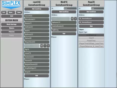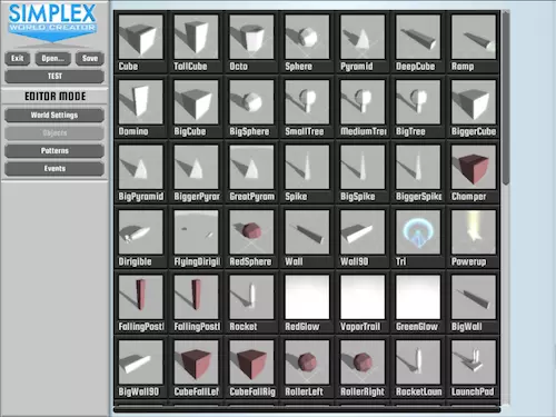 Simplex世界创建器概念与系统快速概述。本指南将帮助你了解世界创建器的工作原理,并助你开启创建新世界的旅程。 首先阅读 撰写本文时,世界创建器尚处于测试阶段。这意味着可能存在漏洞。如果你发现漏洞或希望看到某些改进,欢迎通过创建工单的方式告知我们。 关于文件和格式的说明 编辑器将你的世界以小型.xml文件的形式存储在Steam云盘中。目前计划提供对文件的更直接访问权限,以便能使用xml编辑器轻松编辑(修改)这些文件。编辑器重要限制 开始使用世界创建器前,了解其可创建和不可创建的内容类型很有必要。随着我们不断改进世界创建器,我们希望通过社区的反馈意见,持续消除限制并拓展更多可能性。以下是使用 simplex 世界创建器可以实现的功能: • 创建无尽的单向移动游戏世界,就像内置世界一样 • 更改除玩家飞船外几乎所有事物的配色方案 • 创建各种新的物体和障碍物,并按自定义模式排列 • 通过【事件】为这些障碍物添加动画,实现各种有趣效果 • 更改飞船的物理特性,以及太阳下山速度等参数 • 将天空改为星空纹理并隐藏地面,营造固定移动平面上的太空模式效果 以下是 simplex 世界创建器无法实现的功能: • 制作允许玩家自由向任意方向移动的游戏——或许下一款游戏可以实现 • 完全掌控整个世界的创建过程阅读“基础玩法”部分,了解更多关于世界生成的内容。 •创建新的控制方案或添加武器等内容(未来可能会有变化!)。 •创建违反社区准则的内容并发布。 基础玩法 首先,这里有一个简短的概述视频。