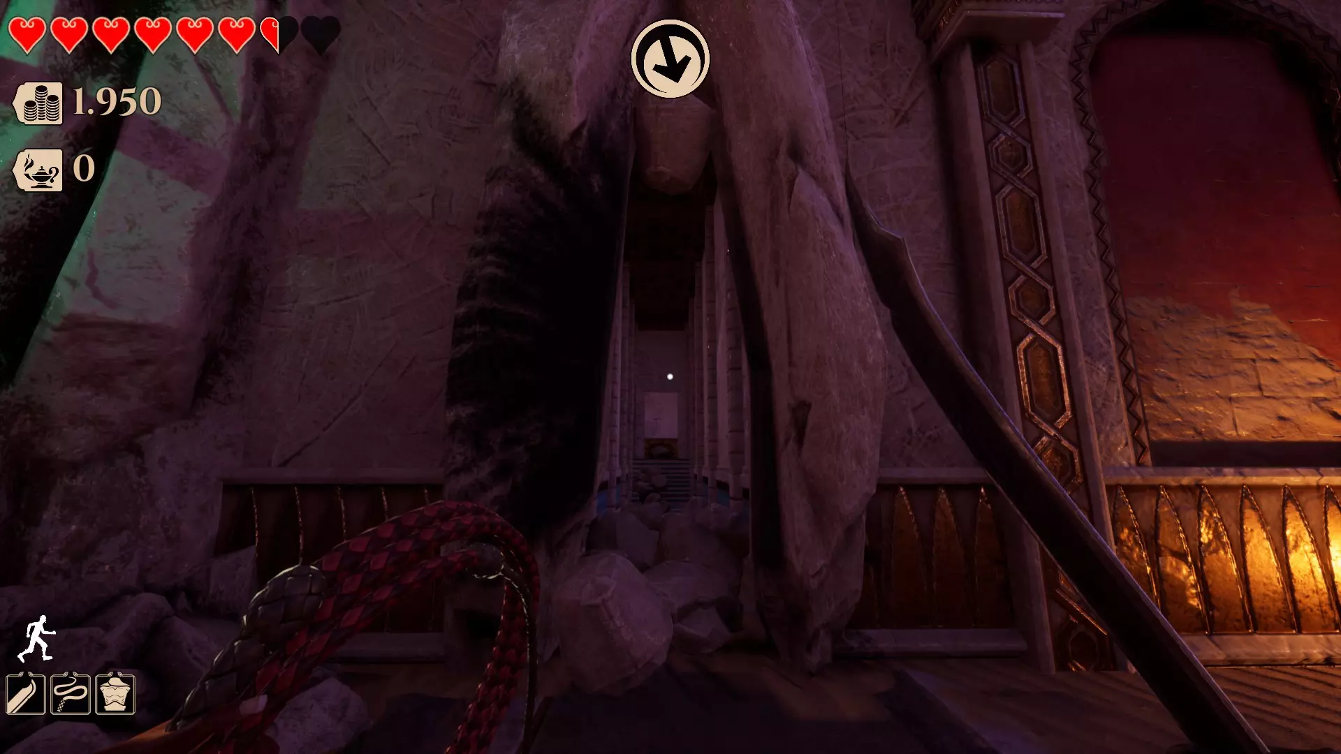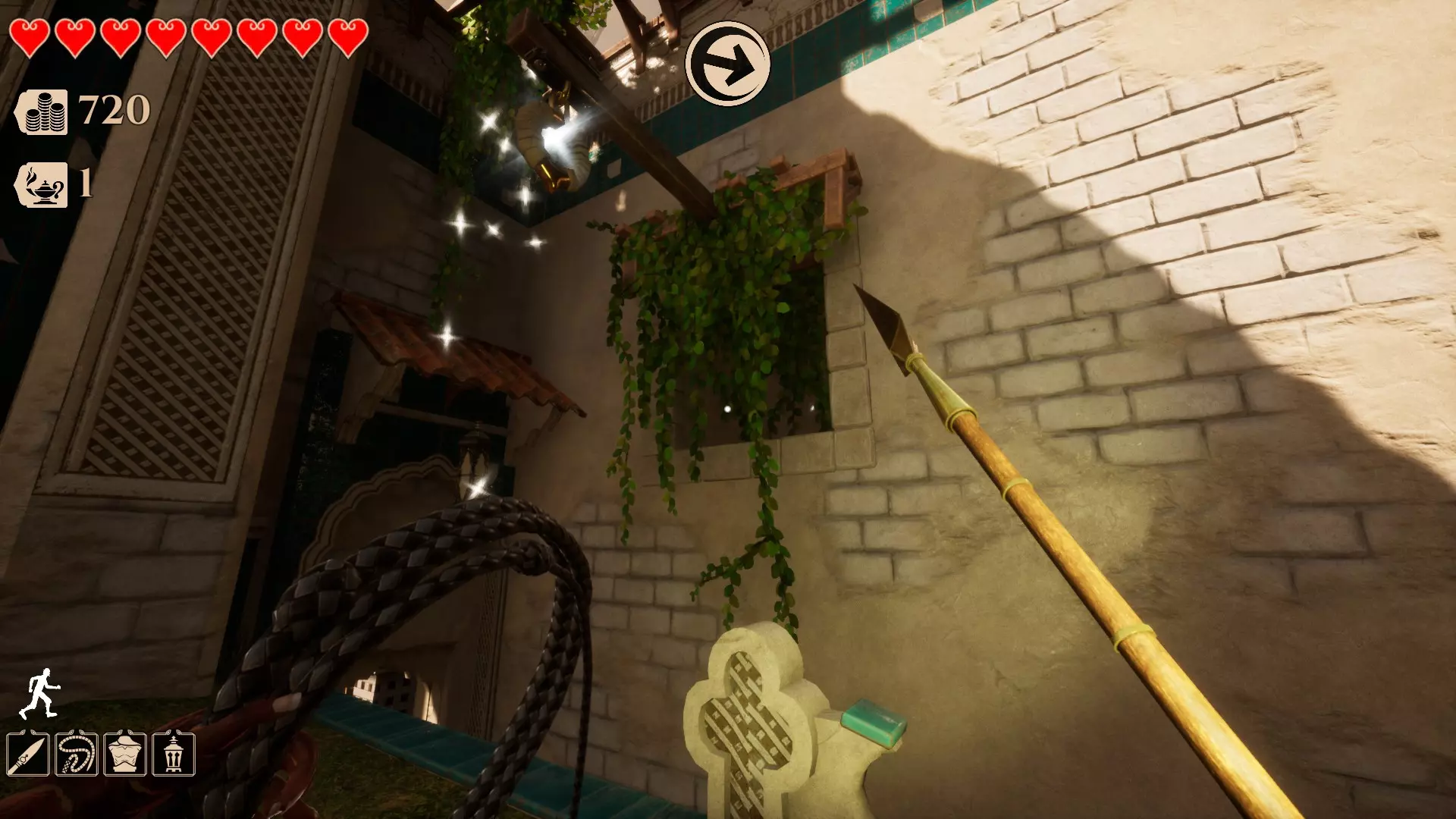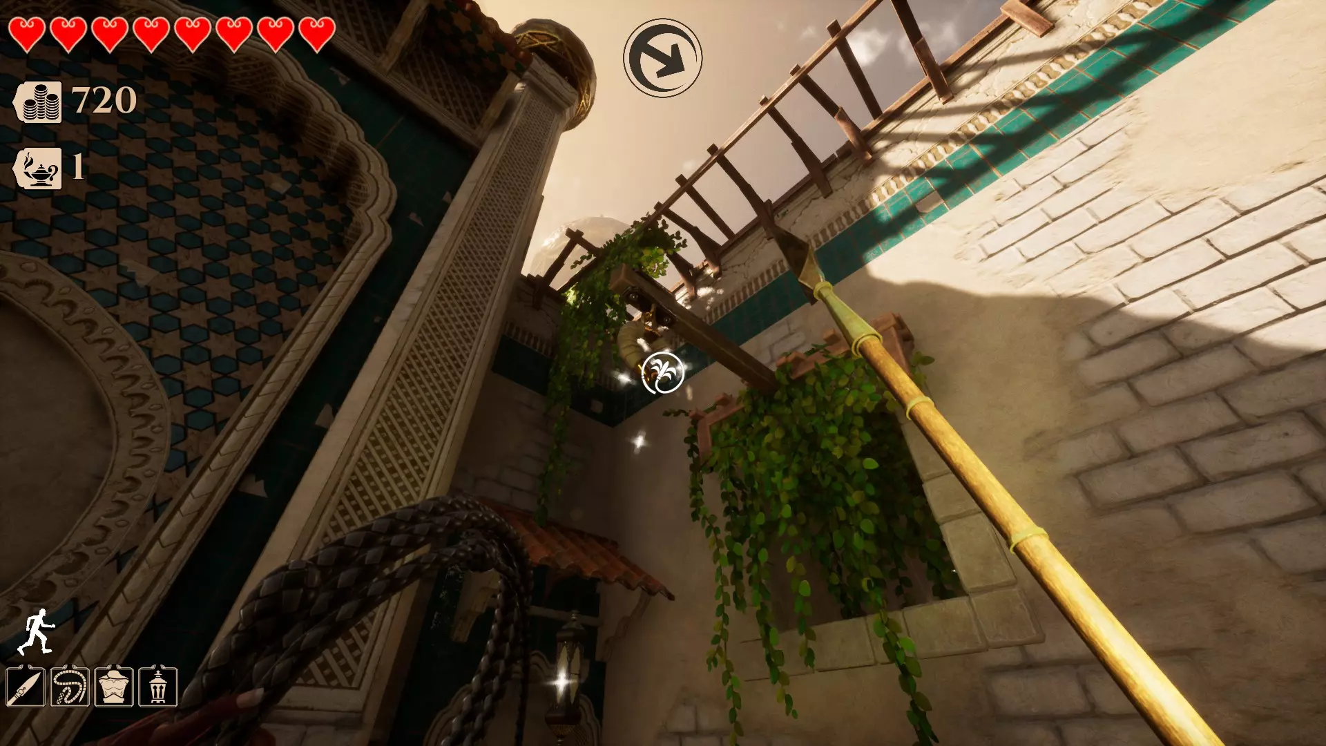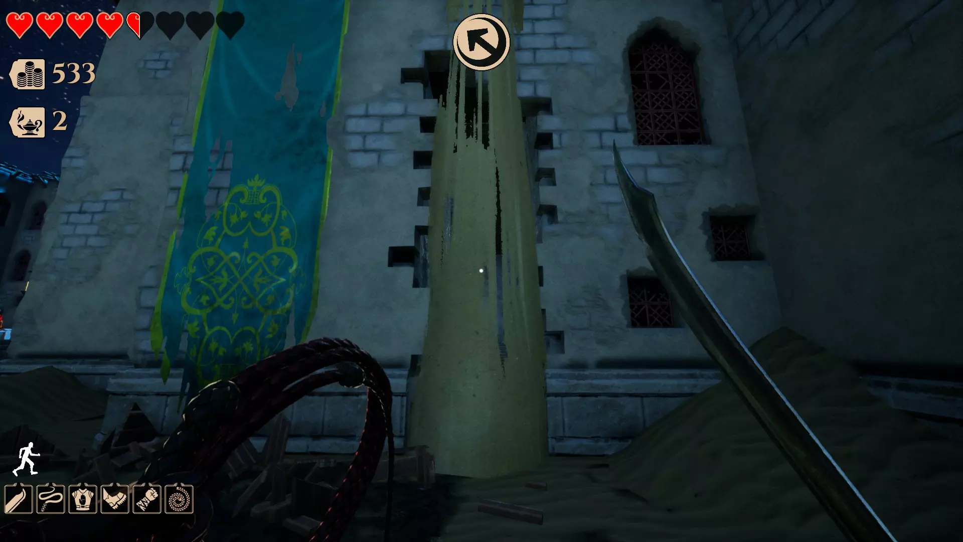 你需要用鞭子(鼠标右键)击打那个圆环才能进入。(提示:按住空格键可以更轻松地抓住边缘并爬上去)
