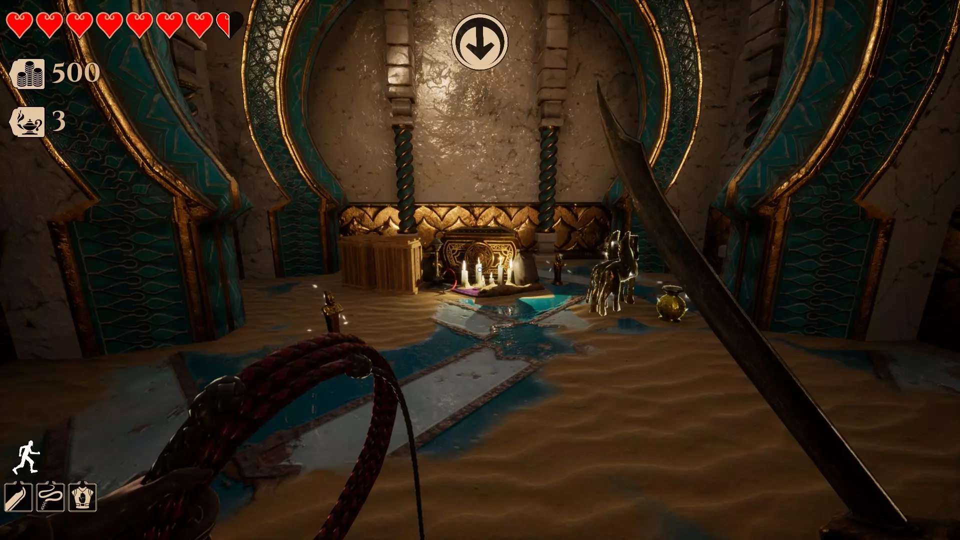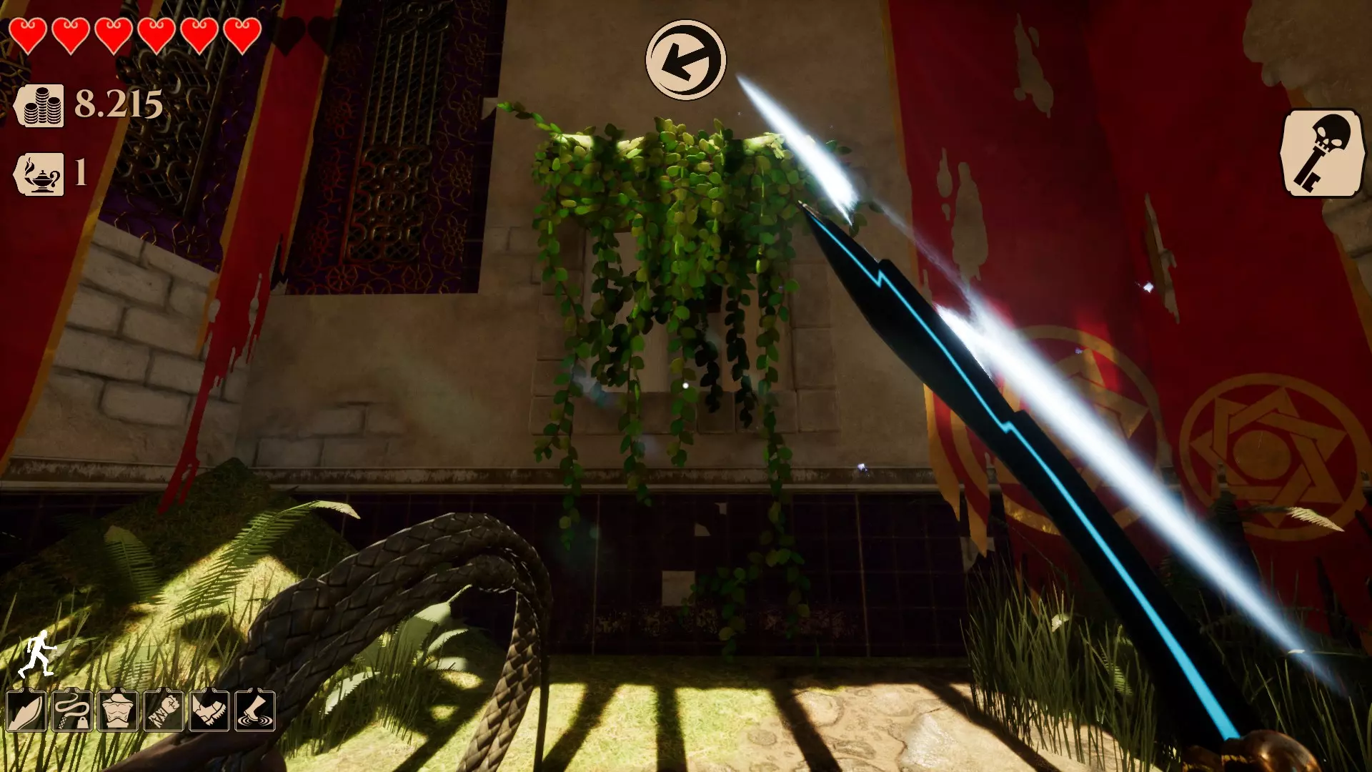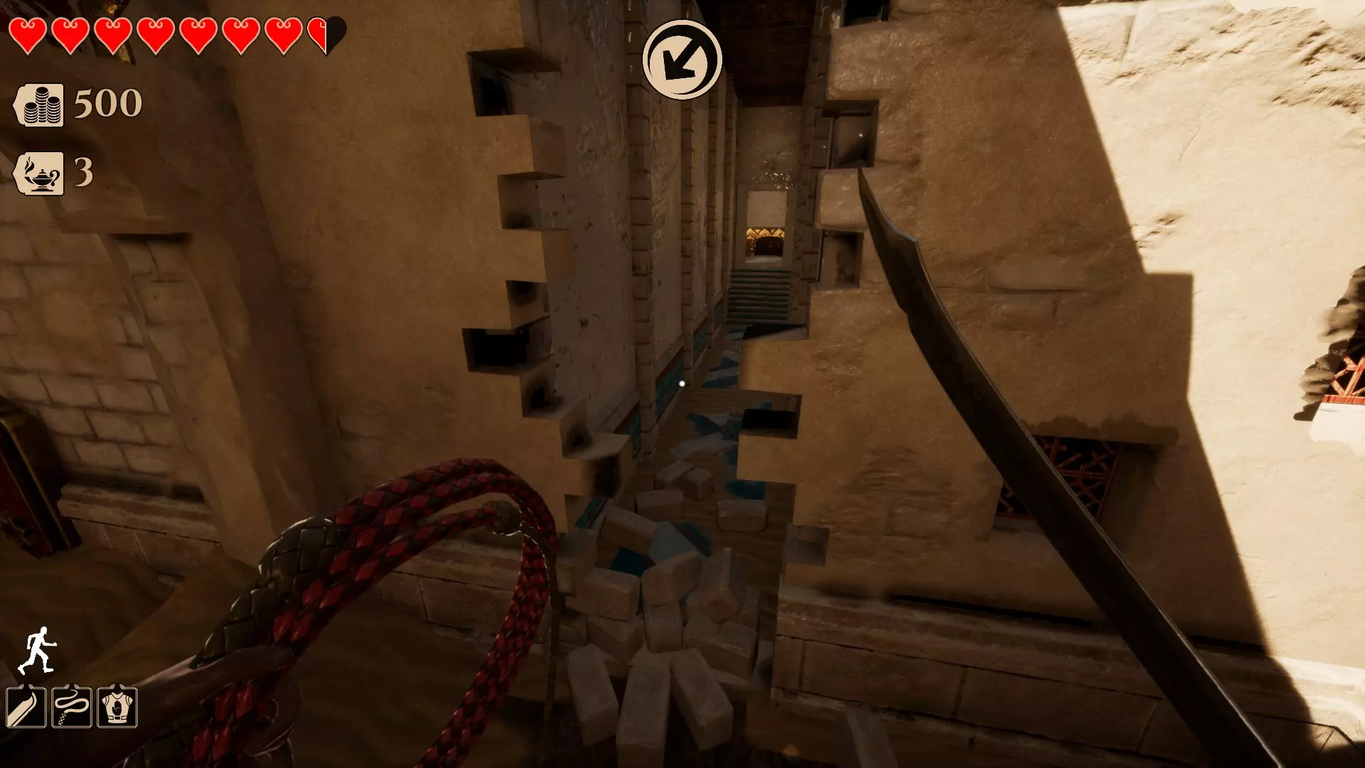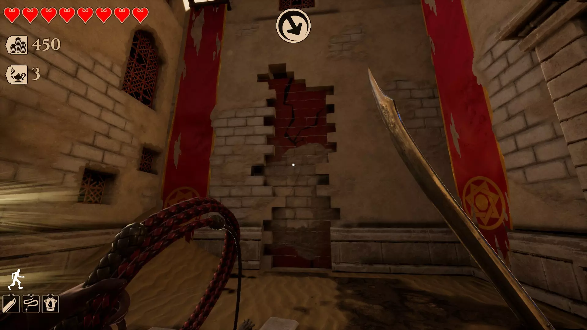 你需要用鞭子(鼠标右键)击打那个圆环才能进入。(提示:按住空格键可以更轻松地抓住边缘并爬上去)