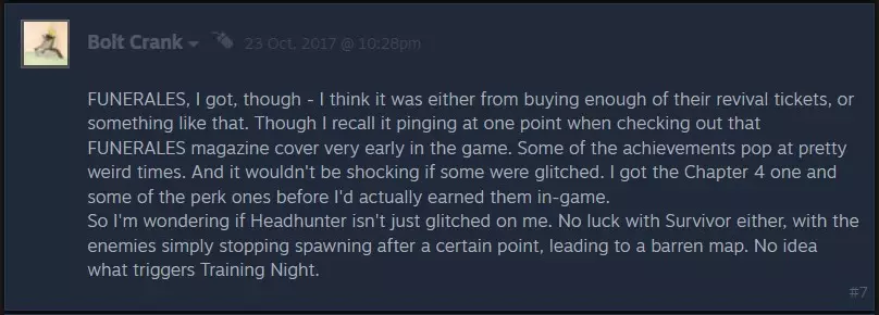 猎头者 回收了1000个纸人偶,还需要更多 解锁条件:击杀1000个纸僵尸 这个成就对我来说也有bug。为了确保达到1000个击杀数,我开始了卧室生存模式,8分钟内获得了200个击杀。我百分百确定我已经杀了超过1000个了。