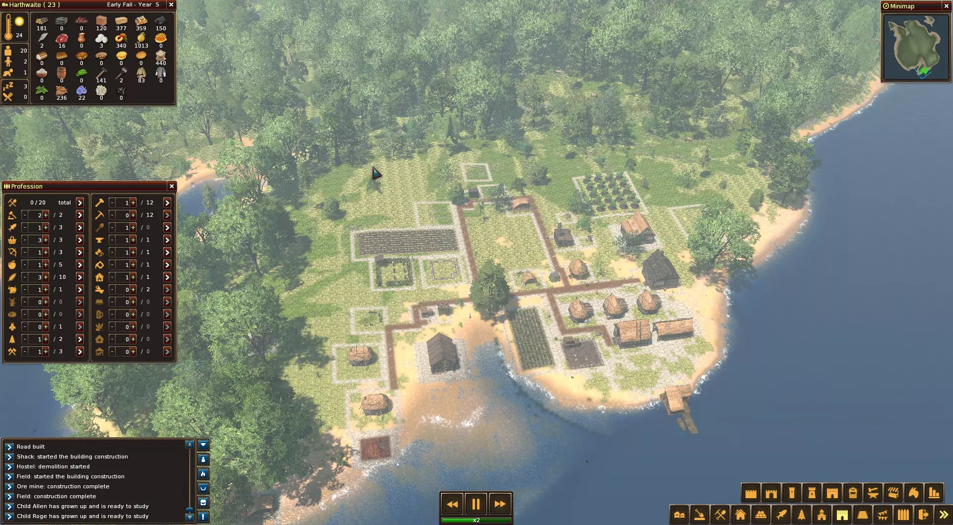 如何建立一个能历经四季与灾难的繁荣社区?其实很简单,只要了解游戏的一些机制就行。来一探究竟吧!对了,这款游戏可不是《放逐之城》哦! 本指南尚未完善,也可能永远不会最终定稿,但欢迎大家提出意见。 简介 《领地人生:林中村落》是一款城市建造类游戏,与《放逐之城》有一些相似之处,但两者的机制不同,玩法和带来的体验也不一样,尤其是在游戏进程深入后,这种差异更为明显。首先需要明确的是,这段文本主要是对《领地人生:林中村落》的一些评价和看法。我们直接来对内容进行汉化处理。 一开始我们就要说清楚,《领地人生:林中村落》并非一款完美的游戏,存在一些有争议的设定,比如 farm animals 不产皮,还有当玩家身处岛屿时,却要通过陆地建筑进行贸易…… 但如果仅仅因为这些细节就否定这款游戏,那可就错了。要是玩家希望改变这些情况,是有 mods 可以修正的,不过我还是更希望这些能在游戏本体中得到改进。 没错,游戏有时确实会出现 bugs,但就我个人而言,几乎总能找到解决办法。如果遇到问题,不妨寻求帮助。 而且,游戏的 AI 并不笨。当然,它还有提升的空间。优先砍伐大树,它们能提供更多木材,让小树继续生长。如果将一片区域的树木完全砍伐,森林的再生速度会变慢。 森林对于为采集者和草药师提供蔬菜、水果和草药至关重要。 动物也会出现在森林中,它们是制作衣物所需皮革的唯一来源(贸易或模组除外)。 温度和天气也会影响你的农作物。界面 为了方便管理你的社区,请始终保持事件日志、信息摘要(人口、资源及其他)以及工人管理窗口处于打开状态,以便根据需求轻松管理职业。当社区扩张时,小地图也有助于快速移动。 资源限制管理窗口不常用,因此可以将其关闭,避免屏幕过于拥挤。 可根据个人偏好排列窗口。 阻止居民消耗资源 例如,如果你禁止使用鸡蛋。村民不会把鸡蛋带回住所食用,但面包师仍可以继续用鸡蛋制作蔬菜馅饼。 食物:采集、狩猎和捕鱼 在《领地人生:林中村落》中,食物是最重要的元素(冬季的取暖木材也同样重要)。 食物来源有多种,每种都有其优缺点。 为确保社区的生存,补充物资是必不可少的。 在游戏的很长一段时间里,环境都是不可忽视的重要食物来源。 然而,要做到这一点,保护森林至关重要。手动模式:在控制模式下,可以猎杀野生动物和采集野生植物,但除非你想沉浸体验或处于危机状况,否则对于大型社区而言,这并非长期可行的方法。 采集:森林在温暖季节能提供大量食物。初期,这是为冬季储备粮食的绝佳方式;即便到了后期,只要在社区周边保留森林,采集依然能发挥作用。 在附近的森林中建造采集营地(采集者小屋),采集者就能自动采集周围的植物。 采集可获得蔬菜和水果,通常蔬菜的数量多于水果。虽然理想情况下建筑区域应被森林覆盖,但其他元素稍有侵占也无妨。建筑离谷仓和房屋越远,采集者需要行走的路程就越长,这会影响他们的生产效率。因此需要找到一个平衡点。 如果未来有建筑侵占过多,完全可以将其迁移到稍远的地方,或者减少分配的工人数量。 狩猎 狩猎可以提供肉类和皮毛。 需要注意的是,一只动物只能提供其中一种资源。是的,这很可惜也不太合理,但目前游戏设定就是如此(不过,如果愿意的话,可以通过模组轻松修正这一点)。 狩猎营地(猎人小屋)可以让工人从事狩猎工作。猎人的主要作用是提供制作衣物所需的兽皮,保护你的牲畜免受捕食者侵扰,以及保护你的社区免受狂犬病(关于疾病我会在后面详细说明)的威胁。 猎人应该部署在森林中,但你也可以将他们安排在靠近建筑物和/或入口的位置,以控制可能在这些区域游荡的野兽。 猎人会实际猎杀动物,因此可能会使一个区域的动物数量减少。 如果发现猎人无所事事,不要犹豫,根据需要调整工人数量。 渔业 渔业的最大好处是提供全年的食物来源,无论季节如何,只要靠近水源即可。渔场(渔夫小屋)的生产力会受到其环境的影响。广阔且深邃的水域能保证鱼类资源丰富,而小型池塘或溪流则可能因过度捕捞而枯竭。 理想情况下,渔场的区域不应过度重叠,尤其是在小型水域中,并且工人数量应根据情况进行调整。 关于渔场的一个使用技巧是:在温暖季节只安排1名工人,以维持一定的鱼类供应;当寒冷来临时,可派遣你的农民和/或采集者进行捕鱼,直至天气转暖。显然,这取决于你的具体情况以及对劳动力和食物资源的需求。 食物:农业与养蜂业 尽管大自然是重要且近乎取之不尽的食物来源,但随着社区的发展,通过其他方式补充食物供给会变得十分有益。 农业是繁荣的支柱。 农业是一种可靠的生产蔬菜或水果的方式,不受环境限制。与采集活动不同,农业不需要在周边保留森林。 然而,农业并非持续的食物来源,需要等待收获时节。每种植物都有其独特特性:湿度和温度偏好、生长周期、产量等。不过,大多数农作物需要通过探险来解锁。农业相关的建筑有两种: 农田:农田没有固定大小,只有最小和最大面积限制。这样可以根据环境和需求灵活调整。 较大的农田不一定更好,关键要考虑每个工人的产出量。农田越大,农民需要行走的距离就越长以进行管理。如果农田靠近谷仓以及能容纳工人的房屋,可能一名农民就足够了。如果田地位置稍远一些,较低的【耕种面积比例】可能会更有利。虽然每个
