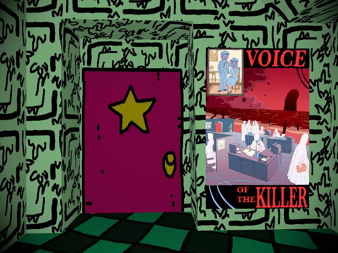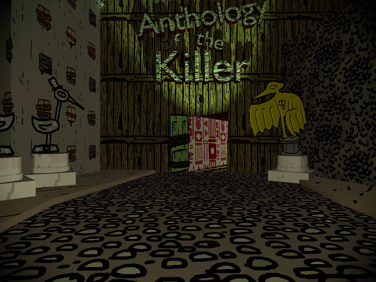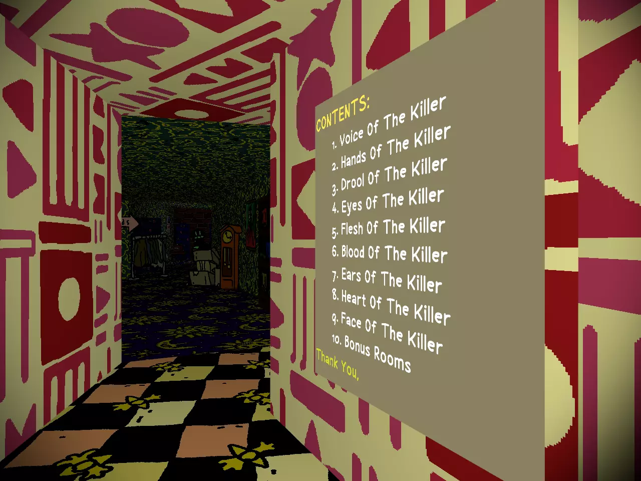欢迎来到【杀手选集】。 上图所示是你的初始区域。使用WASD键或方向键可以移动到你想去的地方。遗憾的是,你无法横向移动,在“开幕之夜”前你一直使用坦克式 controls。不过你几乎不需要用到鼠标。 沿着前方的道路前进,很快就能到达目的地。如果沿着身后的道路走,会导致不良后果,比如被踢回桌面。当你看到“Anthology of the Killer”标志时,就说明你找对地方了。 记住,BB会在这里,你不会想错过的。