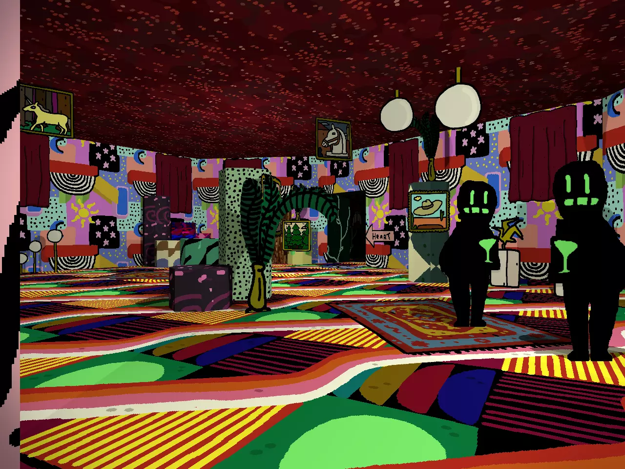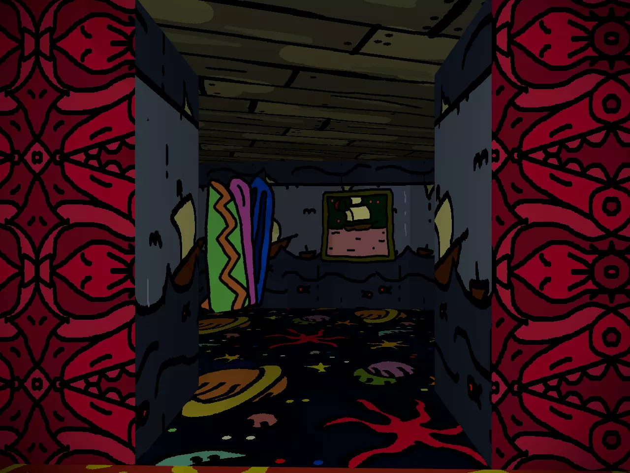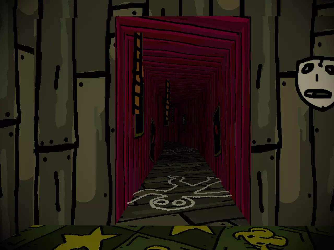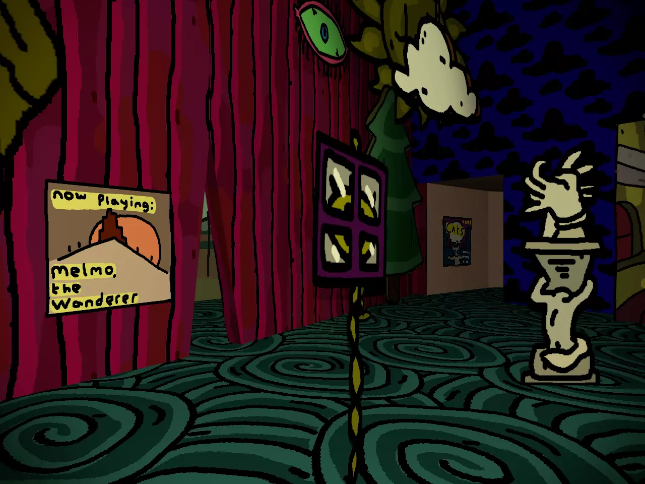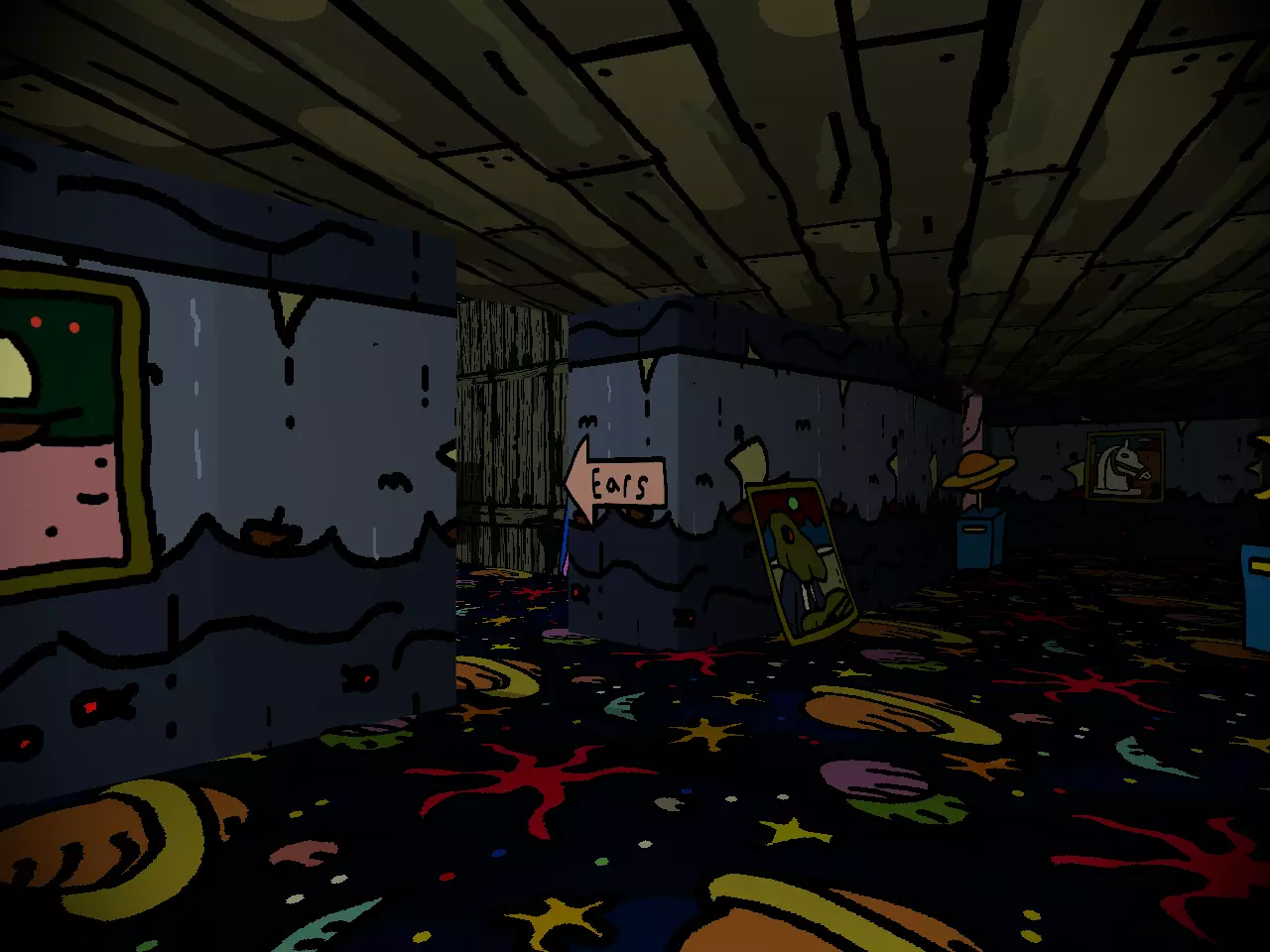 希望你到目前为止玩得开心。你可能也曾有过这样的念头:“我是不是挖掘得太深了?趁还来得及,我该停下来吗?”如果有,把这些念头压下去。或许当地上演的《流浪者梅尔莫》能缓解你的忧虑。 沉浸式戏剧对心灵有奇效。 眼睛。心脏。血液。幸运的是,穿过《流浪者梅尔莫》的幕布就能看到眼睛。如果你一开始没看到,也怪不得你,这些幕布伪装成实心墙的效果出奇地好。 谁说这样的展览不能包含古典文化呢? 在你的右边,或者如果你折返的话就在左边,可以亲身感受更多XX市的文化。路是直的,只有一个小小的转弯。当你返回后,向左走上楼梯,不必在意宾客们的怀疑目光。在你的右侧,经过一堆面具和一些饮水鸟,就能找到血迹。 在你的右侧,或者如果你还没进入走廊的话就直走,那里有最后三个,或者说类似最后的三个。现在别分心,BB就在附近。 你想见BB,对吧?每个人都想。别浪费机会。