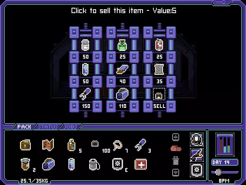 屏幕底部的重量限制?遵守它。相信它。践行它。了解它。热爱它。它会一直伴随着你,始终限制你能携带的物品,甚至会让你完全无法移动,还会限制你能触及或交互的东西。不相信我?在上面的截图中,我甚至无法点击不到一英尺远的储物柜(玩家储物箱),因为我的负重达到了35公斤的上限。 为什么要如此强调它?因为当你在野外、获得奖励或找到一些超棒/酷炫/独特命名的武器时,如果你捡起东西导致超重,你就会被困住,直到减重为止。你不能把东西放下然后回来取。你无法将物品存放在柜子、箱子或储物柜中(除了你在各个基地拥有的那个)。你必须消耗食物、药品或饮料,或者更糟的是,丢弃完好的组件来腾出空间以便移动。 不要因此而措手不及。 交易评分 交易对于你在《Dustbowl》中的成功至关重要。我对任何不通过交易就通关游戏的人表示敬佩,因为我实在想不出这怎么可能做到。话虽如此,游戏初期你肯定会省吃俭用,而正如你所料,到了游戏后期你会有充裕的金钱。以下是一些你可以随时出售的【不需要】物品清单: 乌鸦诱变剂(动物特定掉落物) 乌鸦爪(动物特定掉落物) 乌鸦羽毛(猜猜它来自哪里!) 空香烟盒 空玻璃瓶(最有价值,通常每个能卖4单位货币) 但赚大钱的不那么秘密的诀窍是……