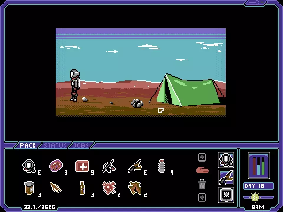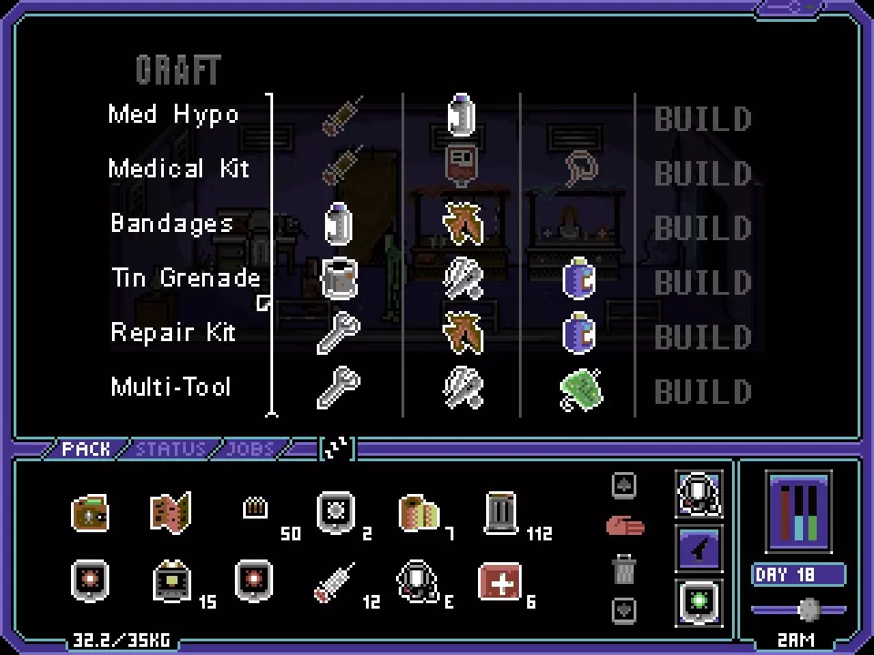 这个界面展示了你在《Dustbowl》中的所有制作选项。制作这些物品无需解锁或特定技能,仅受你手头材料数量的限制(制作物品时,所需材料必须在你的背包中)。 血包可能是最稀有的物品……在我的游戏过程中,我只找到了4个,最多5个。由于没有遇到可能需要血包的人,我唯一的选择就是用它们来制作基础(红色)医疗包。军用级医疗包(蓝色)的治疗量更高,但只能在商店购买、通过搜刮获得或作为奖励获取。 这些物品中第二稀有的是漂白剂。永远不要卖掉你找到的任何漂白剂。至于使用漂白剂制作的物品中哪个更有用,我推荐修理工具包而不是锡制手榴弹。一枚锡制手榴弹对敌人造成50点伤害……震荡手榴弹(商店购买,但游戏内也会作为奖励发放)造成60点伤害。 一般来说,在游戏初期,你应该尽可能制作所有能做的物品。即使是绷带,在战斗间隙进行治疗时也能提供显著帮助。当你进入游戏中期和后期,你需要将制作优先级转向更有用的物品。例如:在游戏初期,绷带(酒精和破布制成)是在激烈战斗后恢复生命值的基本(尽管有些简陋)方式。进入游戏中期后,你会更倾向于制作医疗针剂(脏注射器和酒精制成)而非绷带。 多功能工具是打开储物柜和橱柜的绝佳工具,这些容器(通常)装有珍贵的战利品。在某些情况下,你甚至会发现带有名称或独特的武器,它们会比普通武器造成额外伤害!话虽如此,在《Dustbowl》的一次游戏流程中,你需要的多功能工具数量肯定是有限的(小贴士:查看与多功能工具相关的成就,这是一个不错的初步参考)。 荒地漫游 露营 要在《Dustbowl》的荒地中露营,你需要找到或购买一个单人帐篷。同时要注意,这个帐篷重3公斤,携带它将是一个重要的决定(最大负重似乎为35公斤,且不受游戏内任何因素影响)。 不过,能够露营也有一些优势。以下是你的营地会有的样子: