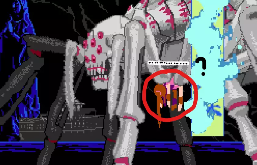 女孩此时嵌在蜘蛛的腹部,拥有受击判定,并有独立于Boss的隐藏血条。
