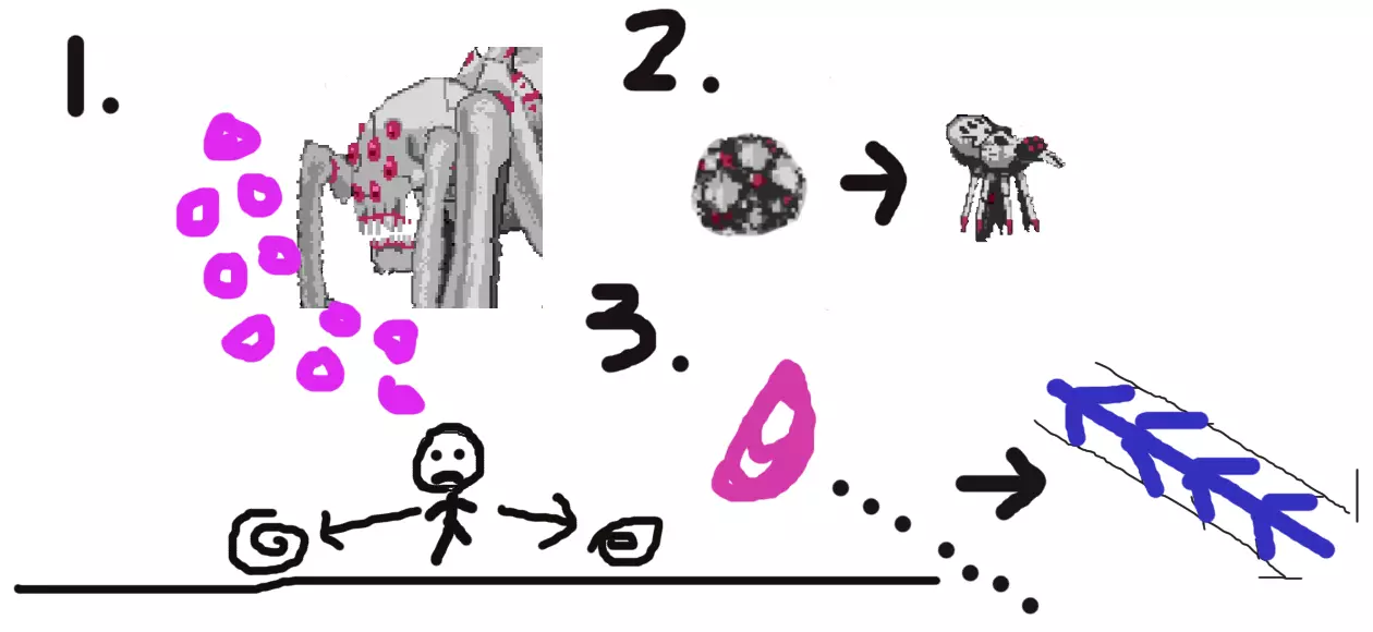 1. 头部:间歇发射两排偶数弹幕,不可破坏。 2. 腹部:从中心向四角发射蜘蛛卵,破坏可获得魂;若卵到达版面上下边缘会形成茧,茧可破坏但无魂奖励,一段时间后蜘蛛茧会孵化出小蜘蛛;上版面的蜘蛛会沿丝垂落至地面,地面的蜘蛛则会试图跳向或爬向玩家。过一段时间后,茧会孵化成小蜘蛛;页面顶部的蜘蛛会顺着蛛丝垂落到地面,地面上的蜘蛛会尝试跳跃或爬向玩家。 3.尾部:由尾部圆形部位发出的三次锁定位置的单光束攻击。 希望这份简短的攻略能帮助你顺利解锁成就,虽然有点粗糙但我相信已经足够解决问题。那么下一个平台游戏有缘再见吧(。・∀・)ノ