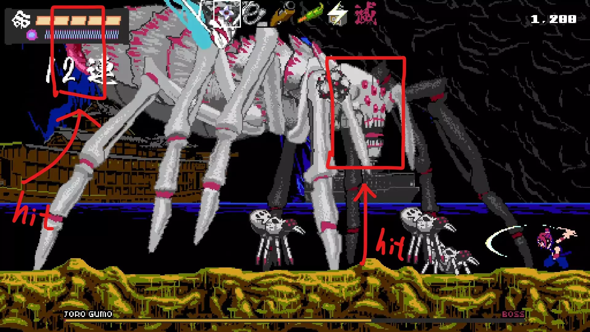 由于偷懒此处并没有提供具体的图片,不过此时旋的血量大概就差两三次普通攻击就没了。 那么,如何避免其血条清零的同时并击破Boss就是接下来的目的。 简单分析一下Boss行为:女郎蜘蛛Boss只有两处可攻击的判定,一处是头部,另一处是尾部的圆形。判定部分似乎有接触伤害,副足部分则没有接触伤害。
