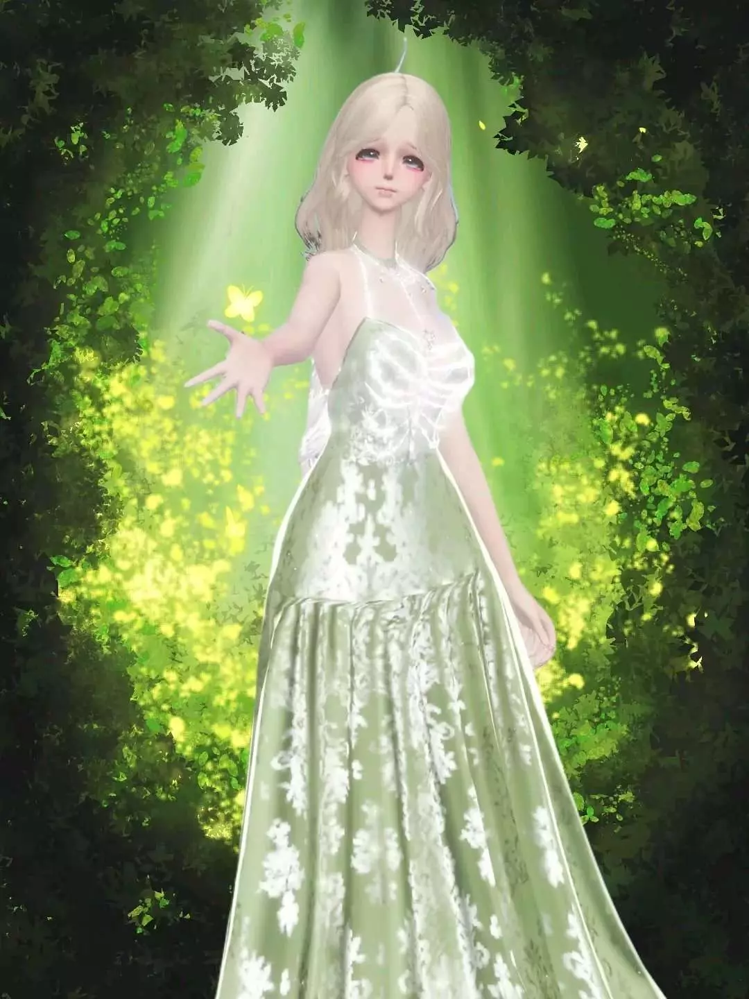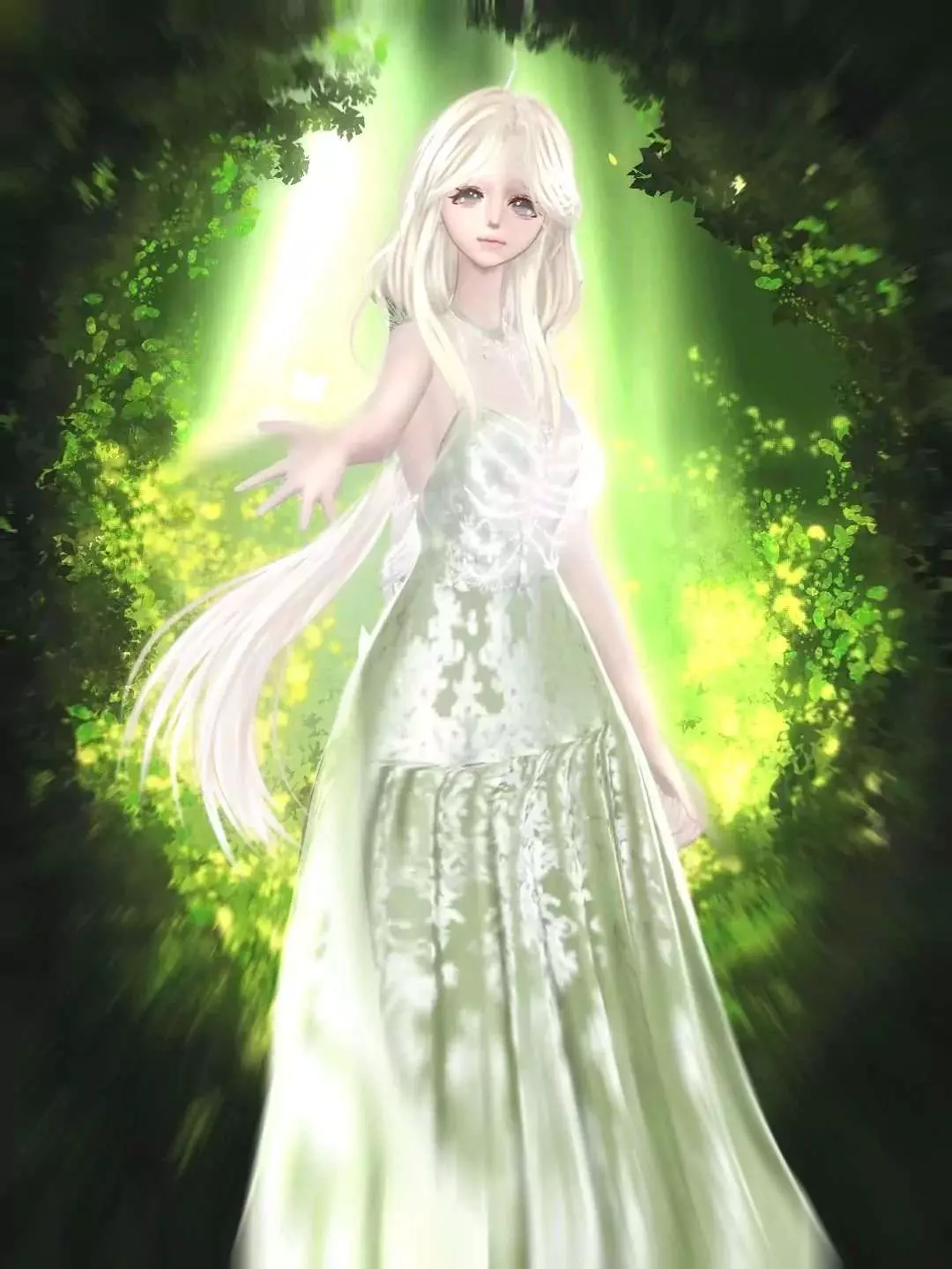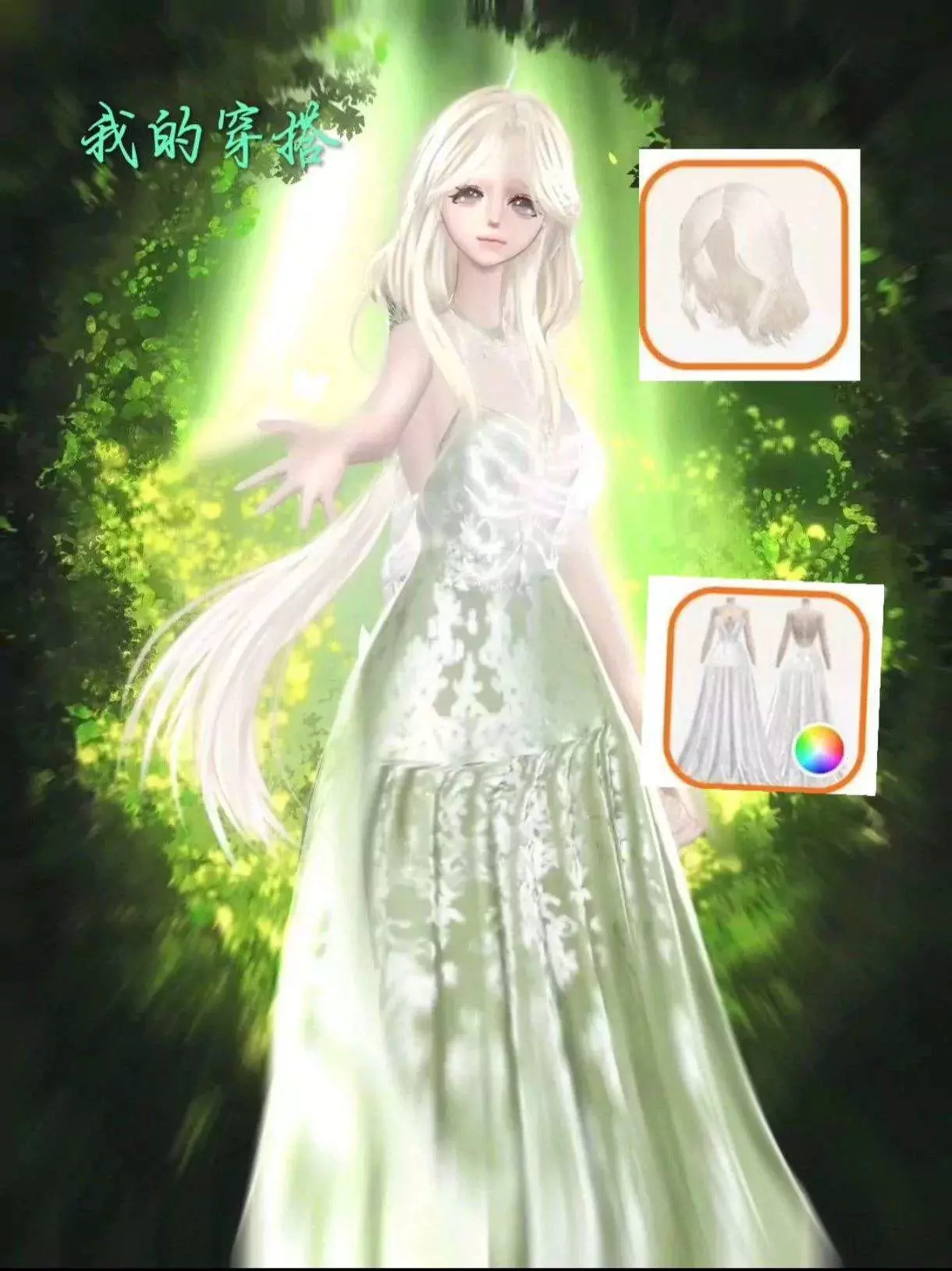 这是一则虚拟穿搭分享帖,展示了通过图层创作的森林系虚拟穿搭,搭配浅绿长裙与浅色长发,呈现出清新的林间精灵风格,还展示了创作的图层界面细节。