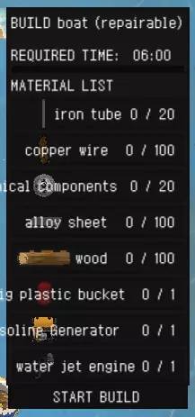 要扑灭身上的火焰,只需在地上翻滚三次。 煤炭不仅可以通过制作获得,还能从燃烧的树木上直接拾取:你可以在林带里大量投掷“莫洛托夫鸡尾酒”,或者使用新的“手持激光枪”(该武器装备在特殊槽位)射击树木来实现这一点。机器人的射击,顺便说一下,对周围的破坏也不小,你可以根据需要调整它的方向,让它专门对着树木射击。 > 船只零件: x20【铁管】 x100【铜线】 x20【机械零件】 x100【合金板】 x100【木材】 x1【大塑料桶】 x1【便携式汽油发电机】 x1【喷水发动机】