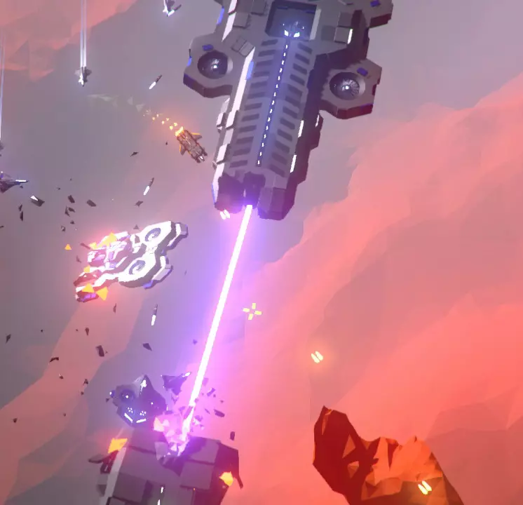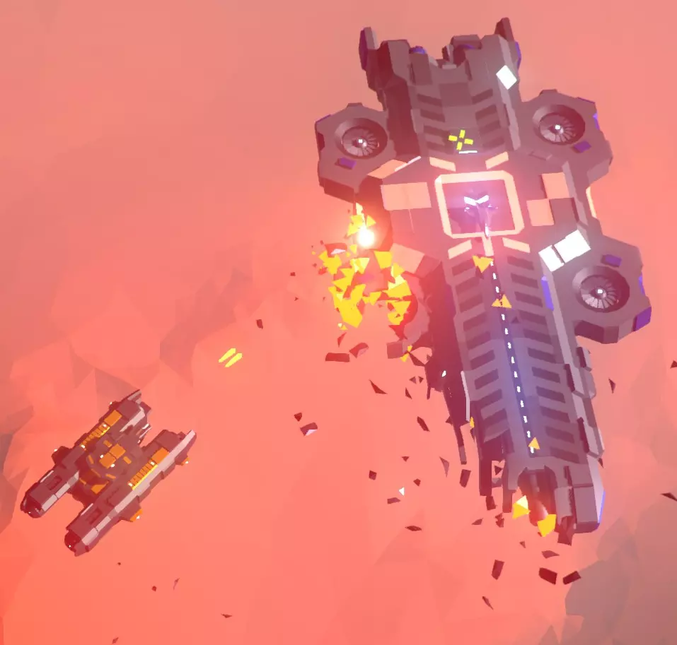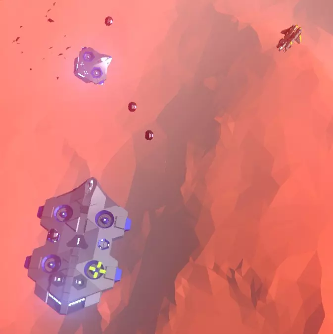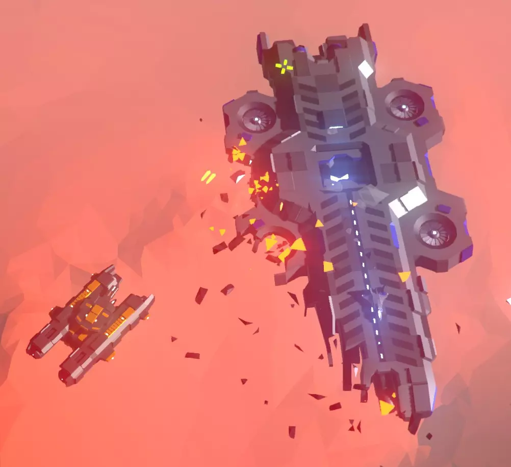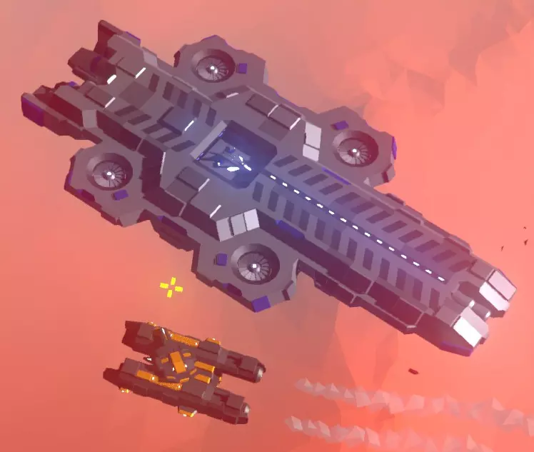 航母;除了对己方母舰构成巨大威胁外,它们对玩家本身无害,只会不断生产猛禽战机;你可以看到一架猛禽战机正从中央机库起飞。 这些是敌方航母。它们每三秒生产一架猛禽战机,战机从中央船体部分起飞。你可以通过攻击中央船体部分来减缓它们的生产速度,这会将起飞频率降低一半,大约每6秒一架。 无论如何,航母都会无限期地生产猛禽战机,很快就会让你的生存希望变得渺茫。 此外,敌方航母配备有前置离子炮,其主要任务是将己方航母撕碎。当处于你的航母射程范围内时,这门加农炮将每10秒发射一次快速双连发炮弹。你可以通过摧毁其相关前部区域来降低射速;但加农炮仍会继续发射,只是射速会降低至每10秒一发。