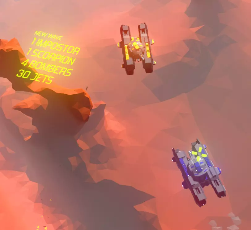 这是受损坦克的外观。它看起来有点像砖块,但炮塔却像全新的一样正常运作! 提示:以这种降低的速度进行冲撞可能会更加困难。通常只有在你直接飞行路径上的敌人被撞击时才会死亡,有时你只会对目标造成严重伤害,这时就需要用炮塔火力进行二次攻击。 如果另一个引擎也损坏了,你的坦克就会将你弹射出逃生舱,让你重新驾驶一架1级战斗机。因此,你需要重新开始升级路径才能再次达到坦克等级,当然前提是你能存活足够长时间来重新获得那个升级。 正如我之前所说,升级是根据击杀数量来进行的,所以无论你驾驶1级还是2级战斗机时获得多少分数都无关紧要。坦克是最后的升级形态。要么保持良好状态,要么在生命值减半时被摧毁,有时战斗机的速度更为有用。 获得15次击杀,你将升级为冲撞等级2的战斗机。正如之前所说,如果你以足够的冲力撞上敌方战斗机或轰炸机,就能将它们摧毁。所以要利用这一点,尽管这是一种有风险的操作。不过这对体型较大的敌人无效。 升级后击杀数会重置;在身为2级战斗机时将击杀数提升至60,即可升级为坦克。这些是【击杀点数】,将计入你的飞船升级进度: - 击落1架喷气机,击杀计数+1; - 击落1架猛禽战机(敌方航母部署的那些速度极快的家伙),获得3点击杀点数; - 击落1架轰炸机(那些双引擎的大家伙,会发射4枚制导导弹),获得5点击杀点数; - 击落1架天蝎战机(配备炮塔的四引擎重型战机),击杀计数+10; - 击落1架采矿机(缓慢的“巨型轰炸机”,会部署制导地雷),击杀计数+20; - 摧毁1架伪装机,获得30点升级分数(相当于半艘航母!); - 最终,击落1艘敌方航母,计为60点击杀点数。 简单来说,喷气机计为1个单位,猛禽战机计为3个喷气机单位,轰炸机计为5个,天蝎战机计为10个,采矿机计为20个,航母计为60个。请注意,如果你驾驶1级战斗机成功击毁敌方航母,你将只能获得2级战斗机的升级。之后仍需积累60点击杀点数才能再次升级为坦克。 例如:你驾驶基础战斗机,尚未取得任何击杀,但成功击落了一架敌方采矿机,此时你将立即获得2级冲撞喷射机的升级。之后击杀计数会重置为0,你需要再获得60点(例如三架采矿机、一架航母或上述敌方单位的组合)才能再次解锁坦克。 战斗提示:坦克是一台杀戮机器;其主炮的威力极为强大,并且可以冲撞战斗机、轰炸机,甚至蝎子和采矿机而不会受到任何伤害。记住这一点,当你的炮塔向其他方向射击时,利用冲撞来消灭更多敌人。 注意,由于操作简便,坦克炮塔无法与坦克车体分离瞄准。 因此,瞄准炮塔会使坦克车体重新对准炮塔瞄准的大致方向。这可能是一个限制因素,但与驾驶战斗机相比,不需要特殊控制或额外按键来专门操作炮塔。 然而,当你的坦克受损(“半血”状态)时,这可能会很棘手。有限的推进力会使转向变得困难,你会变得相当缓慢,几乎成为所有敌人的易攻目标,因此保持坦克完好无损和完全可操作是必须的。如果你能做到的话……敌人第一部分:战斗机、轰炸机、猛禽战机、蝎子战机和伪装战机 战斗机