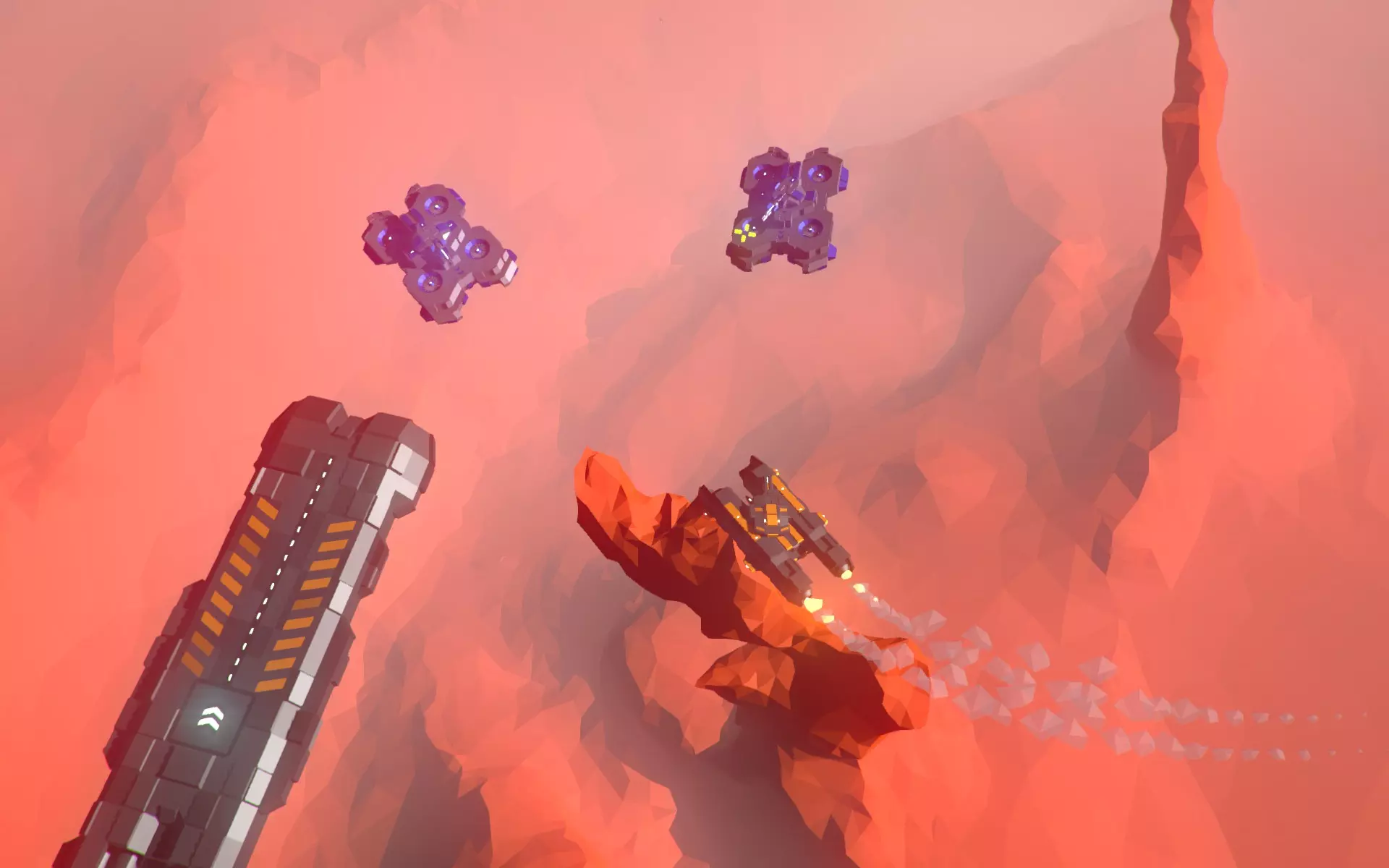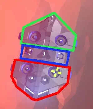 这艘航母的前部/火炮区域以及右前方的悬停引擎已损毁,很快就会坠毁。中央方形区域(即机库)可从侧面攻击。
