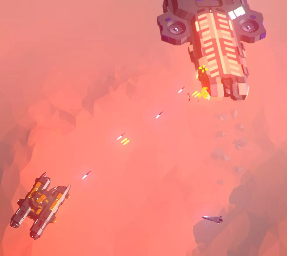 最终升级形态“坦克”,正与两只蝎子进行短暂的友好会面。 提示:坦克几乎可以冲撞除敌方航母外的所有单位。在敌方密集的场景中,这是一个巨大优势!利用自身船体进行绕圈扫射来控制敌方集群非常有效(例如:在每波开始时,无需将来袭轰炸机击落,通过绕圈冲撞它们,同时用炮塔击落战斗机或其他单位)。与二级战斗机一样,撞击敌人不会让你受到任何伤害,只有敌方炮火、导弹和地雷才会造成伤害。 关于导弹的提示:只有当你停止射击至少1秒后,导弹才会重新装填。这次之后再次开火,飞船(无论是2级战斗机还是坦克)都会向敌人发射一些不错的追踪导弹。但问题是……你很难为了那该死的一秒钟停止射击。