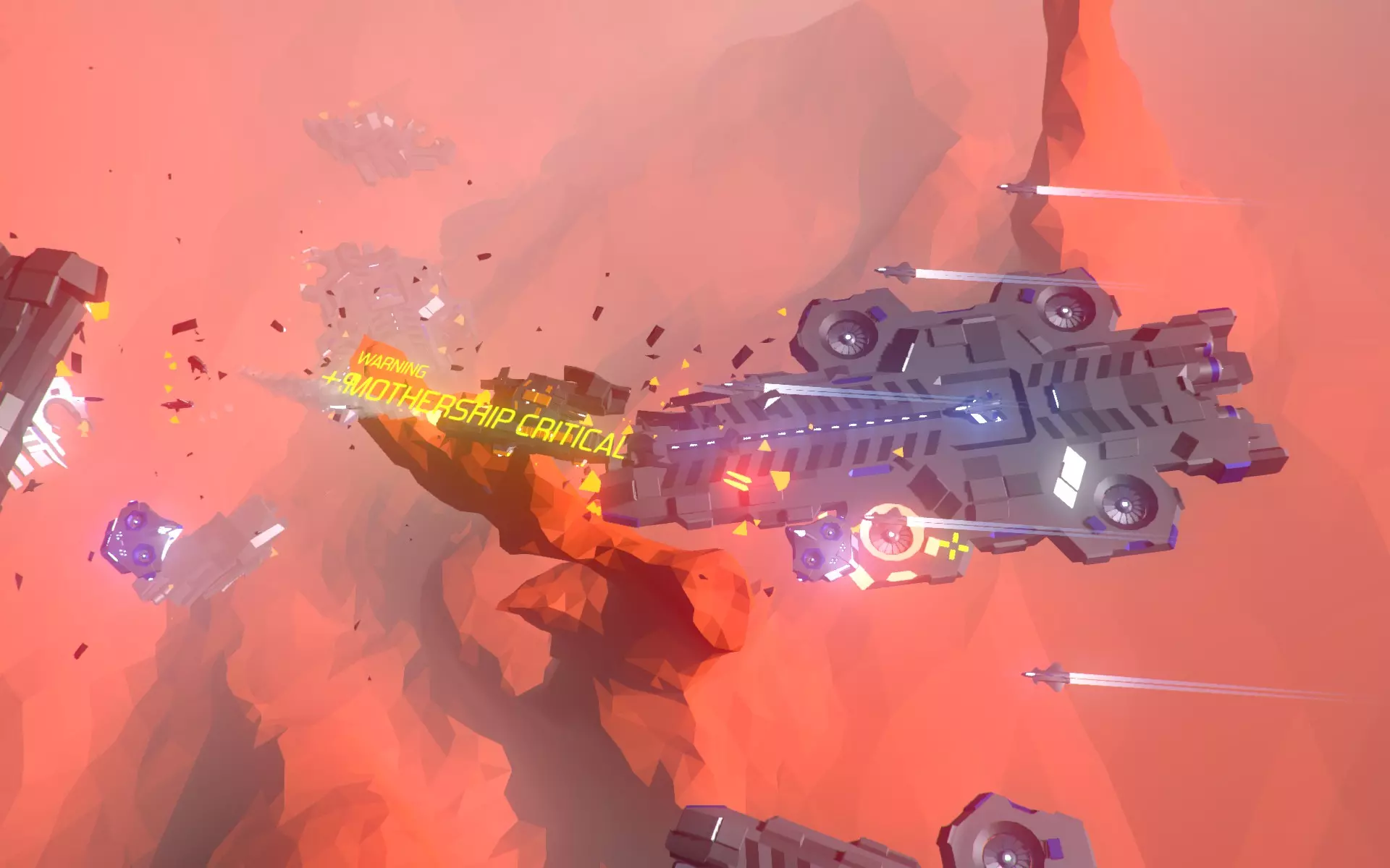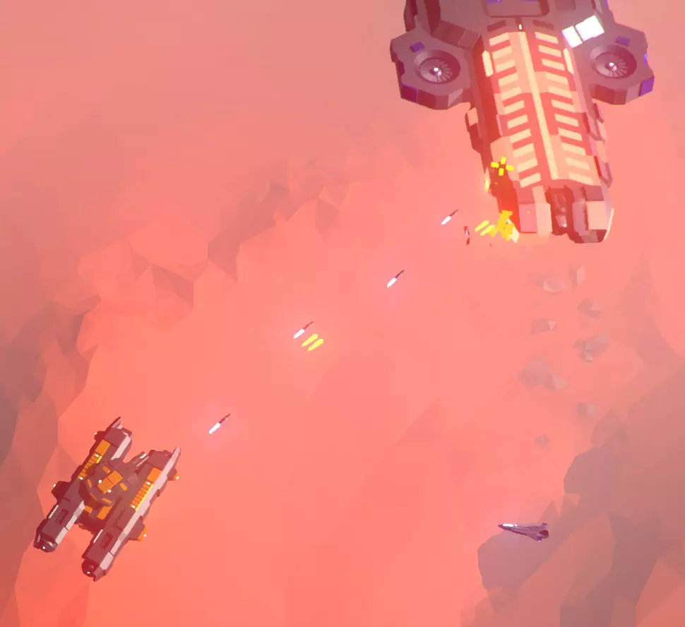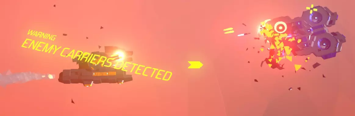 此屏幕显示机库/中央武器点正受到损坏。 它们的生成位置离你的友方航母并不远,因此几秒钟内就会靠近航母,并很快开始破坏这艘无武装友舰的船体。 提示1:无论何种情况,航母都是你的首要目标。敌方航母的主炮只需四发炮弹,你的航母就会被摧毁,即便你仍存活且状态良好,游戏也会因此结束(这种情况常常会导致你对某个游戏外设、自己的桌子发泄怒火,或是发出隔壁街区都能听到的咒骂)。 此外,游戏常常会生成由两艘而非一艘航母组成的波次(在屏幕上一片混乱的情况下,请注意留意“警告:检测到多艘航母”的提示)。