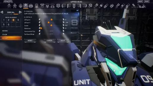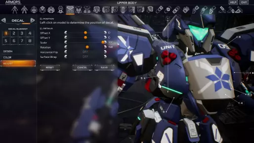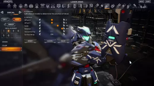 贴花教程:普鲁士蓝星自定义示例 总共有8个贴花,第1个贴花位于图层底部,第8个贴花位于图层顶部。得益于这种分层机制,你可以制作自定义徽标或符号,但这需要占用一些贴花数量,所以请合理使用! 在【调整】选项卡中,你可以将贴花重新定位到所选部件的任意位置。同时会出现网格,以帮助显示你正在哪个表面上进行重新定位。