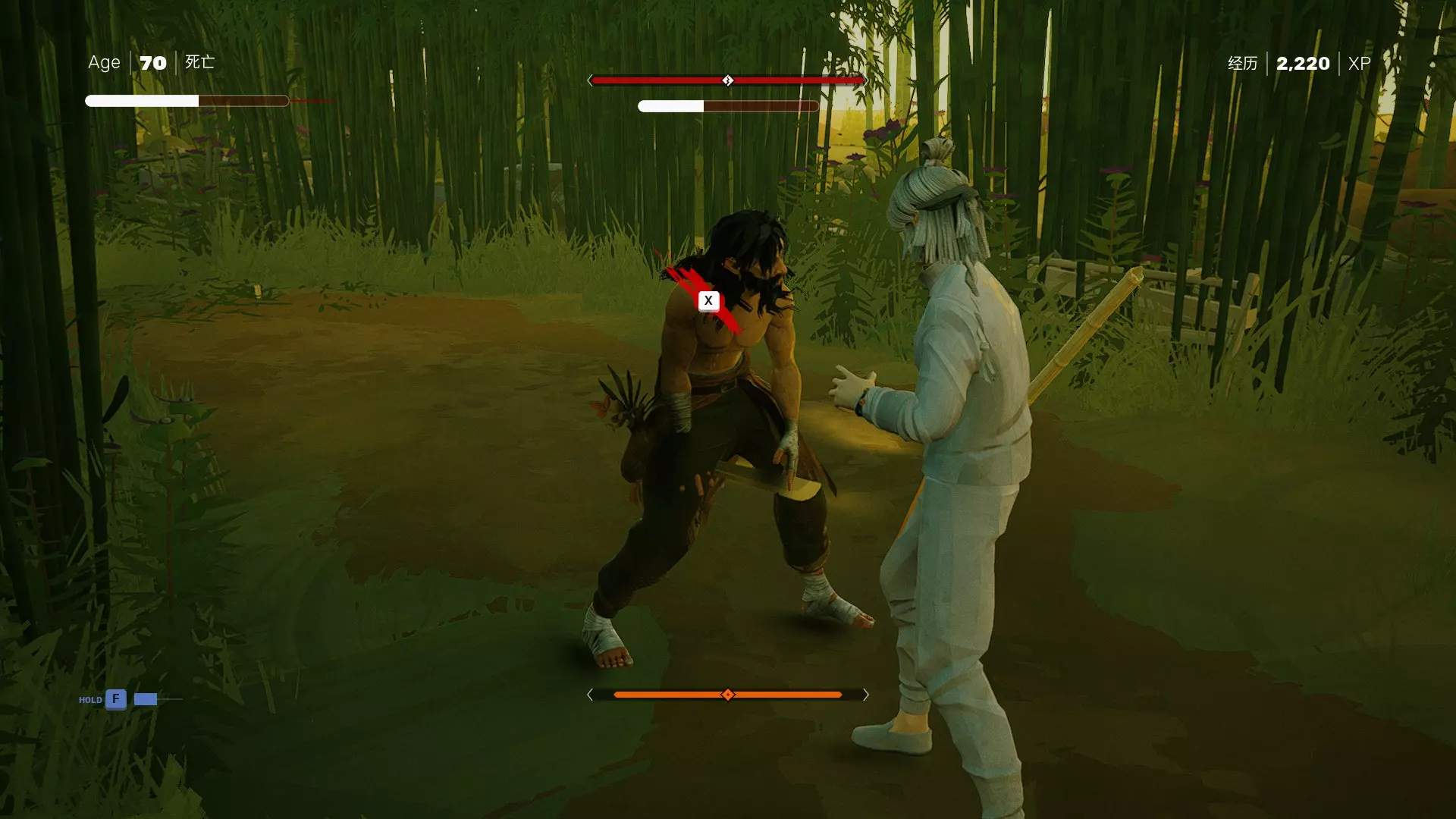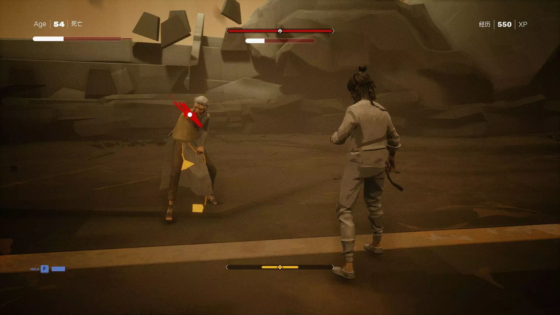 在这个阶段,竞技场中不再有武器。如果你从第一阶段成功携带了武器,那会让战斗变得简单一些。不过你的武器很可能在击破他的架势条之前就会损坏,所以你必须依靠闪避和格挡。要避免承受高额伤害,尽量使用轻攻击。如果在他的架势条被击破前就将其生命值打空,你将无法选择饶恕。第二次击破他的架势条后,你就可以选择饶恕,从而在武德之路上解锁更多内容。