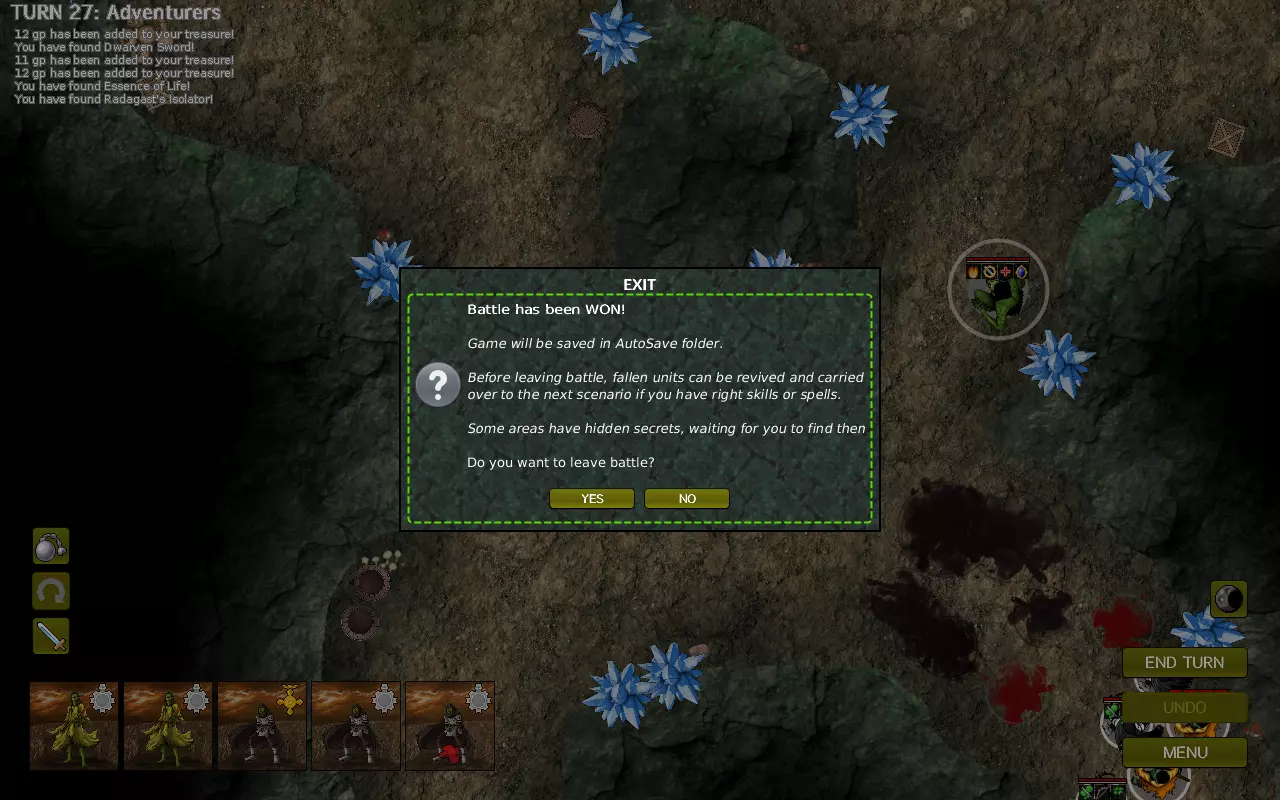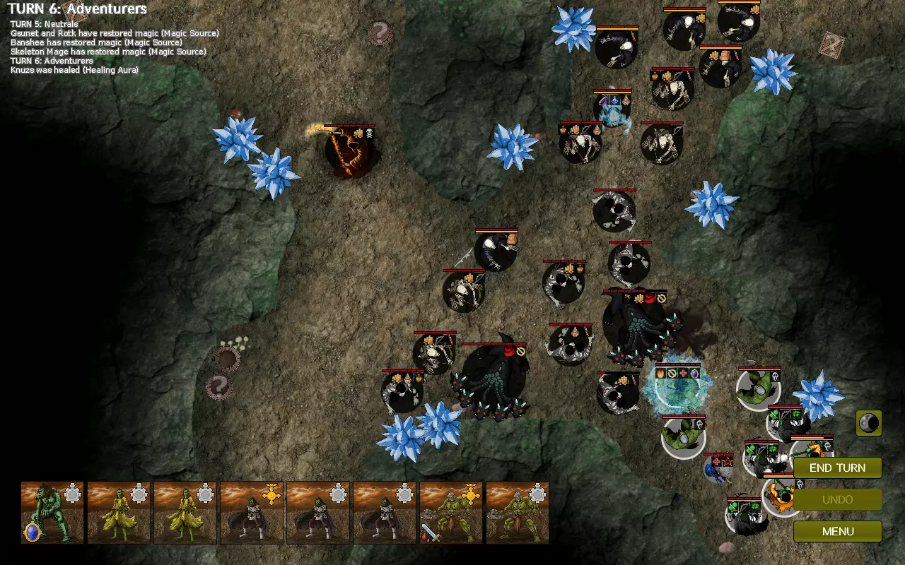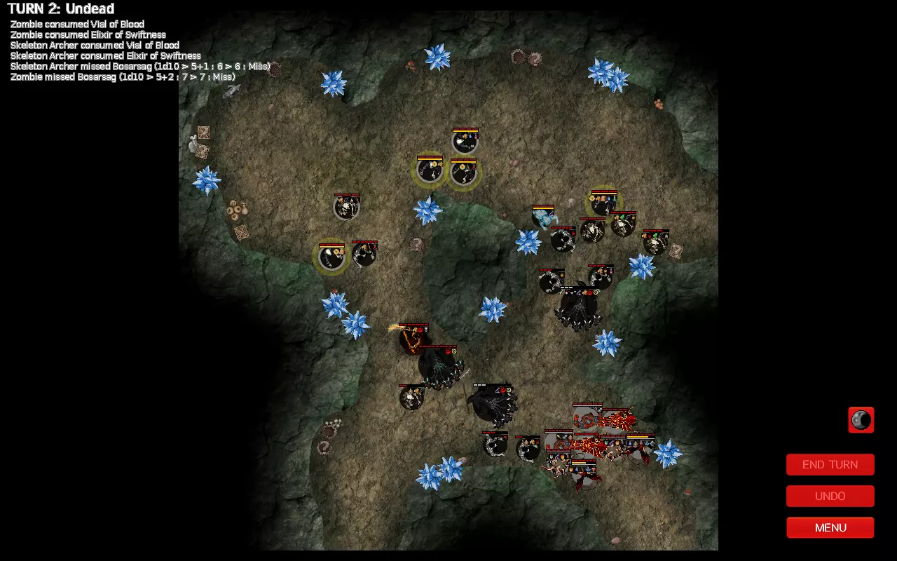 战斗发展: 尽管敌人数量众多,但大部分都集中在地图北部,不过在第二回合就会有一名骷髅弓箭手、一个僵尸以及多头蛇吸血鬼向你发起攻击。 初期回合比较容易应对,因为多头蛇会堵住通道,而骷髅弓箭手也不在射程范围内。利用这些回合尽可能消灭多头蛇以及左侧的骷髅。为此,你应该使用停滞药剂,它能提供90%的命中率。同时,要始终保持治疗效果激活,这样任何箭矢造成的伤害都能立即恢复。 尽量不要同时使用两个同类型的图腾,因为图腾的用途不止于其光环效果。在整个战斗过程中,敌人会缓慢但坚定地向你逼近,因此你必须密切留意其中一个骷髅法师(在西北方向生成的那个),因为他拥有火球法术,若不加以小心,可能会击杀你的后排单位。幸运的是,这样的骷髅法师只有一个,其他4个法师都不会使用该技能。 另一个可能摧毁你整个军队的单位是拥有相位和收割者技能的尸妖。要时刻追踪他,防止他接近你的后排,一击秒杀你的萨满或前排兽人,导致你的阵型崩溃。 这里的技巧是利用图腾填补阵型中的空隙,使尸妖没有空间进行跳跃。立即集中火力,因为它只需2-3回合就能靠近并直接跳到后排,而你没有足够的图腾来填补所有缺口。必要时使用停滞药剂。 采用此策略,你的巨魔将能缓慢但稳定地消灭九头蛇,而无敌药剂将帮助你的单位无视最终会遭遇的箭雨。 当九头蛇和巫妖都被消灭后,就该打破阵型,向法师和弓箭手发起冲锋了。 女妖比普通骷髅优先级更高,因为诅咒法术会降低单位的攻击力,而麻痹攻击会降低你的防御力。在它们使你的巨魔失去战斗力之前解决掉它们。