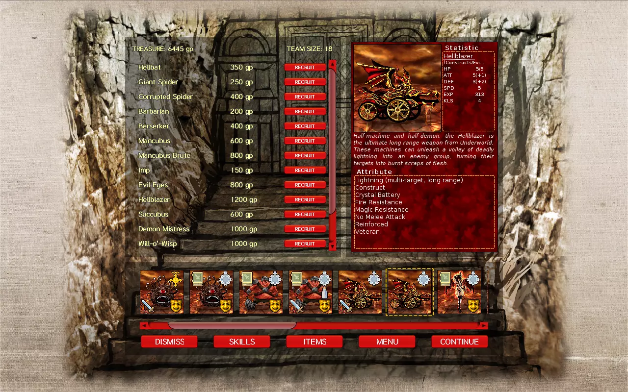 法术使用: 此时你的英雄将成为恶魔女主人,她能提供三个非常强力的法术:无敌护甲、邪恶之力和心灵控制。 如果你的单位因某种原因承受大量伤害,你可以用无敌护甲保护它们,虽然单位每回合会受到1点伤害,但这很容易用邪恶之力来抵消——该法术能为单位增加2点生命值,且可对同一单位多次使用。 由于法力不是问题(得益于法力水晶),或者如果你带了2名及以上的恶魔女主人,你可以每隔几回合就给单位增加2点生命值,这样单位就不会因法术失效而受到2点伤害,因为法术永远不会失效。 偶尔,你会遇到需要让魔像冲锋的场景。如果你不携带或不愿意使用迅捷药剂,可以控制他们的心智,使其获得额外移动力和本回合2次攻击机会,从而成为强大的伤害输出者。如果你的远程单位未命中,可利用此方法击杀尸巫。