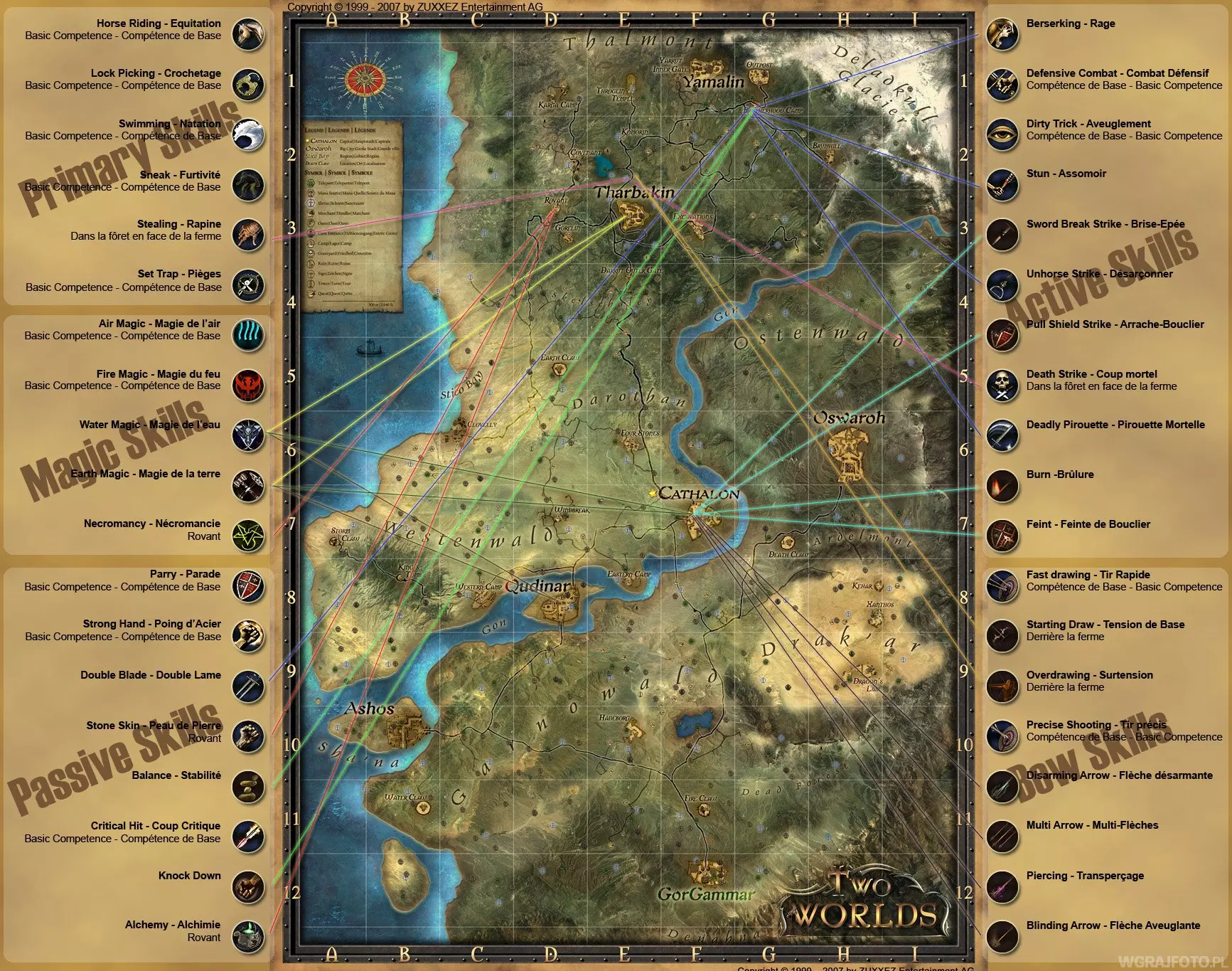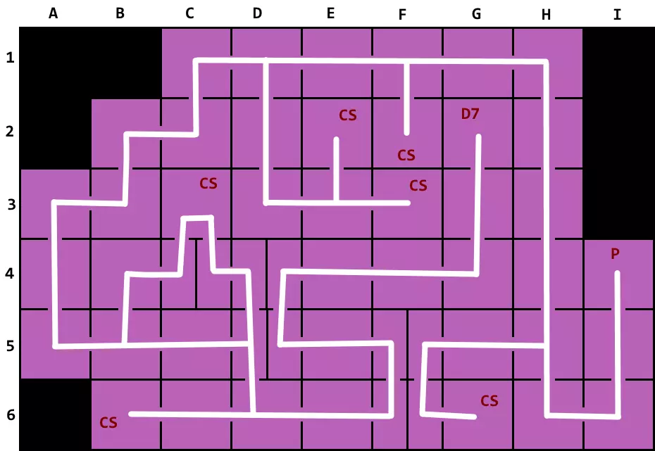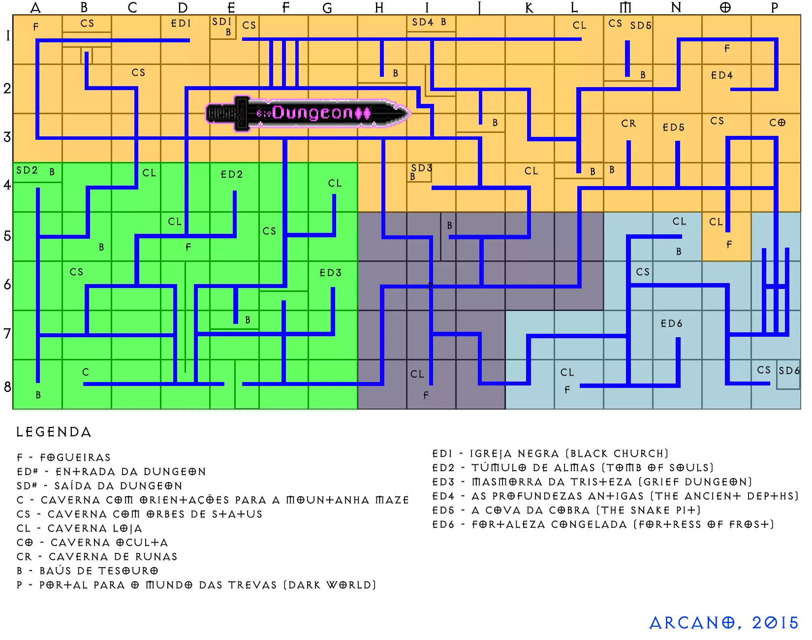 (点击查看完整尺寸) 地图图例:F - 营火 D# - 地牢入口 E# - 地牢出口 CS - 含有属性宝珠的洞穴 CT - 可购买宝藏的洞穴 H - 隐藏洞穴 T - 世界地图上的宝箱 P - 通往黑暗世界的传送门 地牢列表:D1 - 黑色教堂 D2 - 灵魂之墓 D3 - 悲伤地牢 D4 - 远古深渊 D5 - 蛇穴 D6 - 寒霜堡垒 世界地图重要地点 B1 - 从B2进入可到达洞穴 B8 - 含有山地迷宫方向的洞穴 C4 - 宝箱中有神秘物品,需32金币开启 F2 - 山地迷宫 - 上中、左上、右上 K4 - 宝箱中有神秘物品,需300金币开启 M3 - 符文商人 P6 - 向右进入冰冻迷宫或向上继续前进。右下、右、左上、右可通往“冰魔像”黑暗世界地图